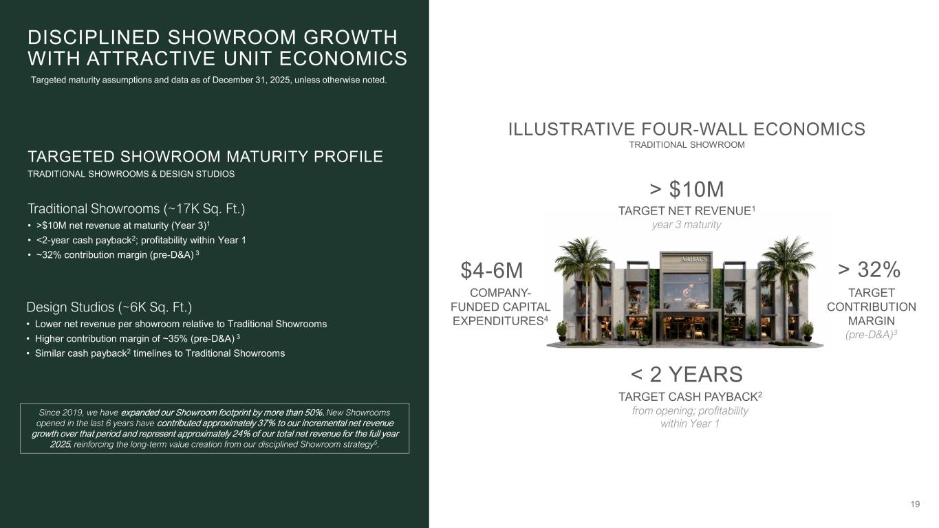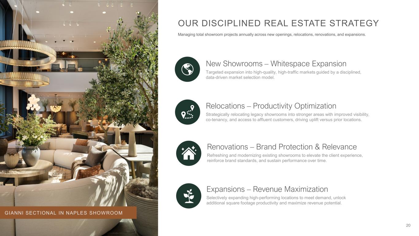 19 DISCIPLINED SHOWROOM GROWTH WITH ATTRACTIVE UNIT ECONOMICS Targeted maturity assumptions and data as of December 31, 2025, unless otherwise noted. ILLUSTRATIVE FOUR-WALL ECONOMICS TRADITIONAL SHOWROOM > $10M TARGET NET REVENUE1 year 3 maturity < 2 YEARS TARGET CASH PAYBACK2 from opening; profitability within Year 1 $4-6M COMPANY- FUNDED CAPITAL EXPENDITURES4 > 32% TARGET CONTRIBUTION MARGIN (pre-D&A)3 TARGETED SHOWROOM MATURITY PROFILE TRADITIONAL SHOWROOMS & DESIGN STUDIOS Traditional Showrooms (~17K Sq. Ft.) • >$10M net revenue at maturity (Year 3)1 • <2-year cash payback2; profitability within Year 1 • ~32% contribution margin (pre-D&A) 3 Design Studios (~6K Sq. Ft.) • Lower net revenue per showroom relative to Traditional Showrooms • Higher contribution margin of ~35% (pre-D&A) 3 • Similar cash payback2 timelines to Traditional Showrooms Since 2019, we have expanded our Showroom footprint by more than 50%. New Showrooms opened in the last 6 years have contributed approximately 37% to our incremental net revenue growth over that period and represent approximately 24% of our total net revenue for the full year 2025, reinforcing the long-term value creation from our disciplined Showroom strategy5.