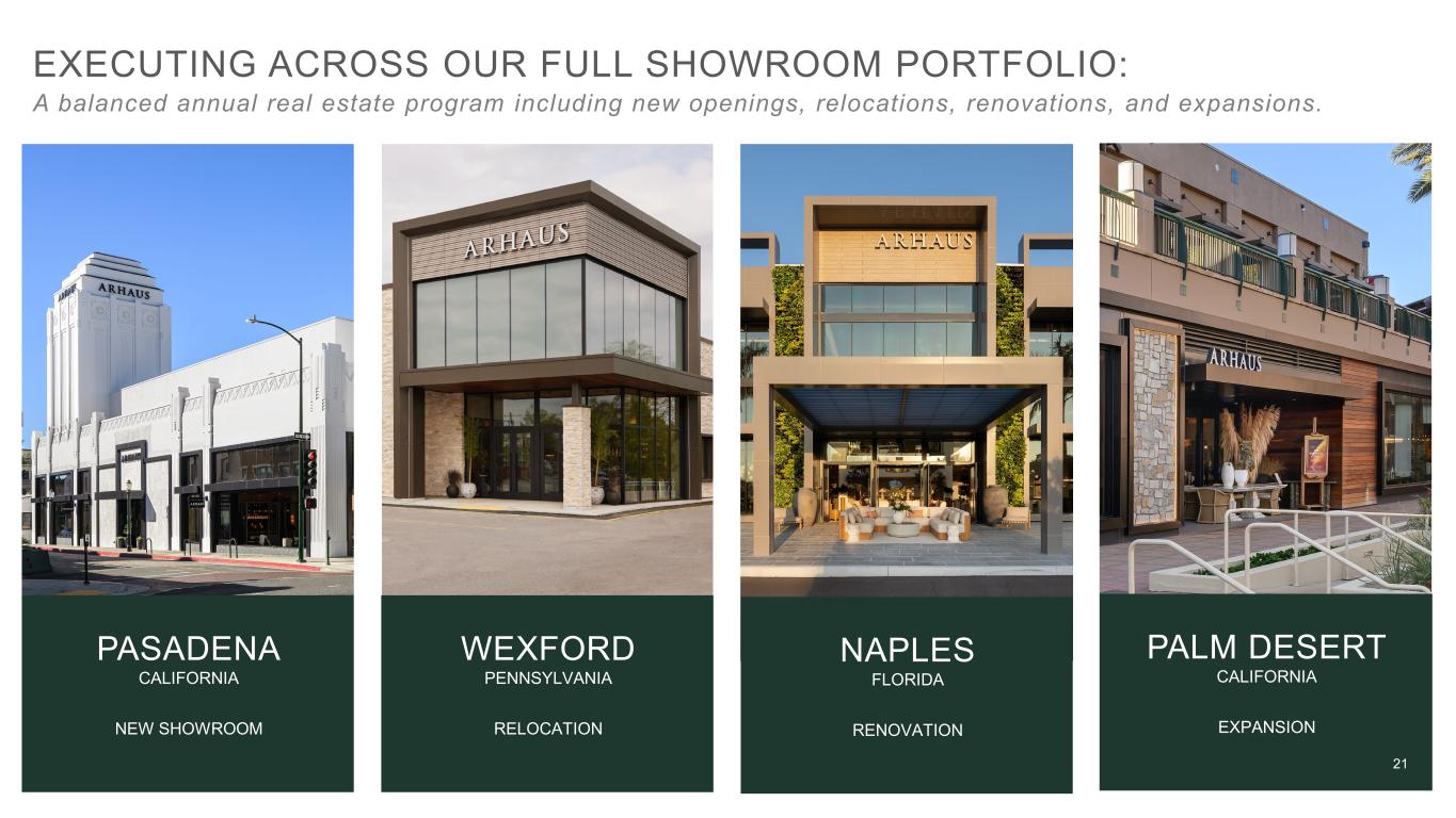 20 OUR DISCIPLINED REAL ESTATE STRATEGY Managing total showroom projects annually across new openings, relocations, renovations, and expansions. New Showrooms – Whitespace Expansion Targeted expansion into high-quality, high-traffic markets guided by a disciplined, data-driven market selection model. Relocations – Productivity Optimization Strategically relocating legacy showrooms into stronger areas with improved visibility, co-tenancy, and access to affluent customers, driving uplift versus prior locations. Renovations – Brand Protection & Relevance Refreshing and modernizing existing showrooms to elevate the client experience, reinforce brand standards, and sustain performance over time. Expansions – Revenue Maximization Selectively expanding high-performing locations to meet demand, unlock additional square footage productivity and maximize revenue potential. GIANNI SECTIONAL IN NAPLES SHOWROOM
