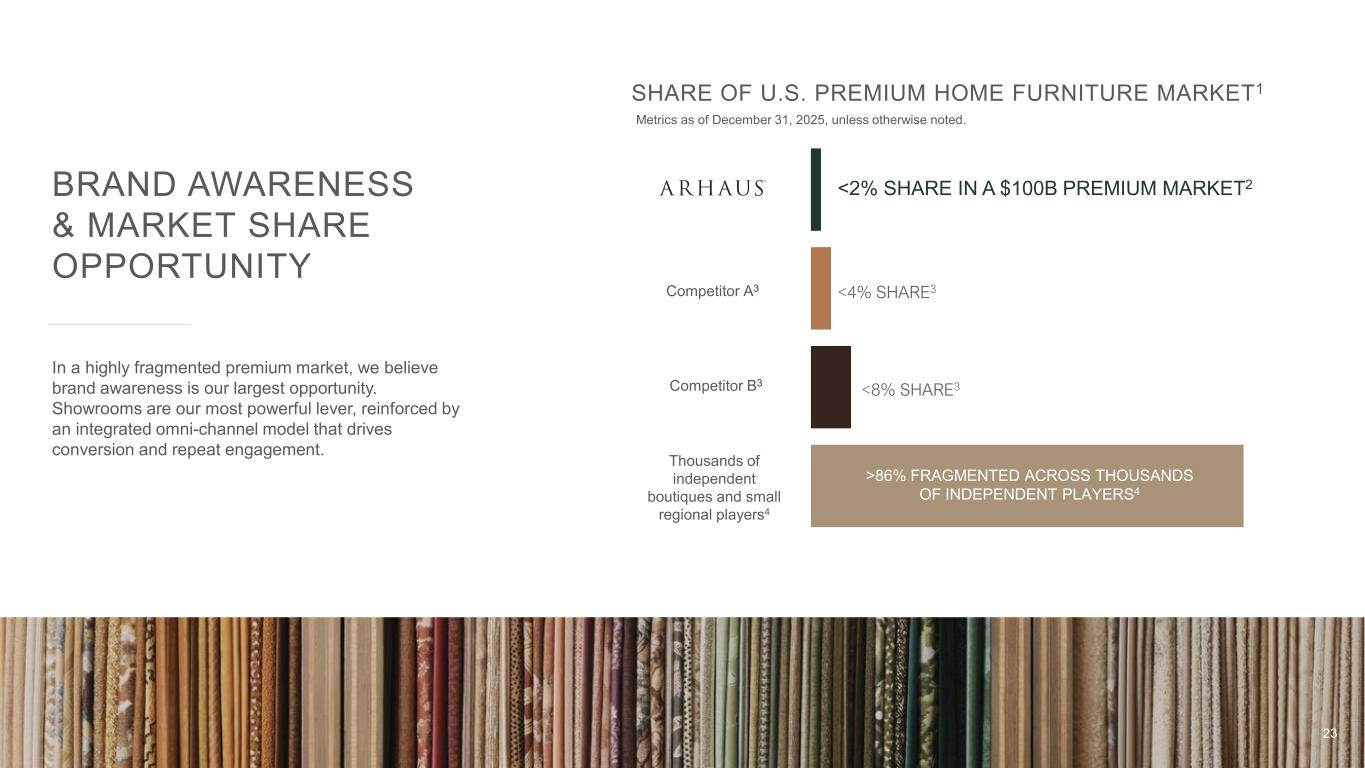 BRAND AWARENESS & MARKET SHARE OPPORTUNITY In a highly fragmented premium market, we believe brand awareness is our largest opportunity. Showrooms are our most powerful lever, reinforced by an integrated omni-channel model that drives conversion and repeat engagement. SHARE OF U.S. PREMIUM HOME FURNITURE MARKET1 <2% SHARE IN A $100B PREMIUM MARKET2 Thousands of independent boutiques and small regional players4 <4% SHARE3 <8% SHARE3 >86% FRAGMENTED ACROSS THOUSANDS OF INDEPENDENT PLAYERS4 Competitor A3 Competitor B3 Metrics as of December 31, 2025, unless otherwise noted. 23