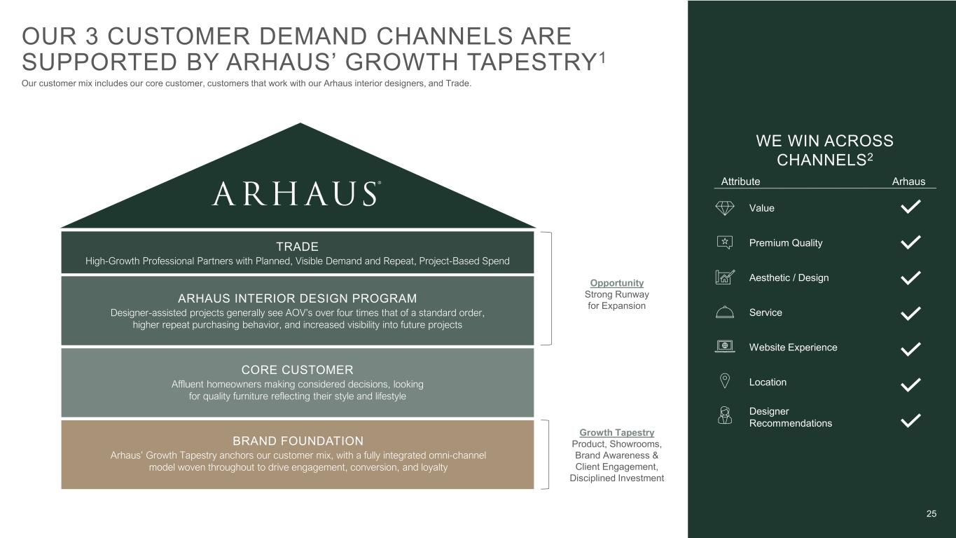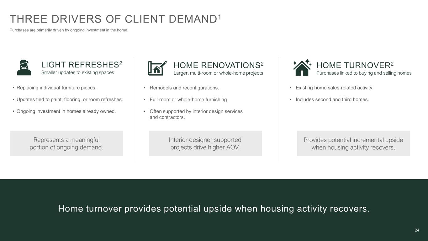 24 THREE DRIVERS OF CLIENT DEMAND1 Purchases are primarily driven by ongoing investment in the home. 24 LIGHT REFRESHES2 Smaller updates to existing spaces • Replacing individual furniture pieces. • Updates tied to paint, flooring, or room refreshes. • Ongoing investment in homes already owned. HOME RENOVATIONS2 Larger, multi-room or whole-home projects HOME TURNOVER2 Purchases linked to buying and selling homes Represents a meaningful portion of ongoing demand. Interior designer supported projects drive higher AOV. Provides potential incremental upside when housing activity recovers. • Remodels and reconfigurations. • Full-room or whole-home furnishing. • Often supported by interior design services and contractors. • Existing home sales-related activity. • Includes second and third homes. Home turnover provides potential upside when housing activity recovers.