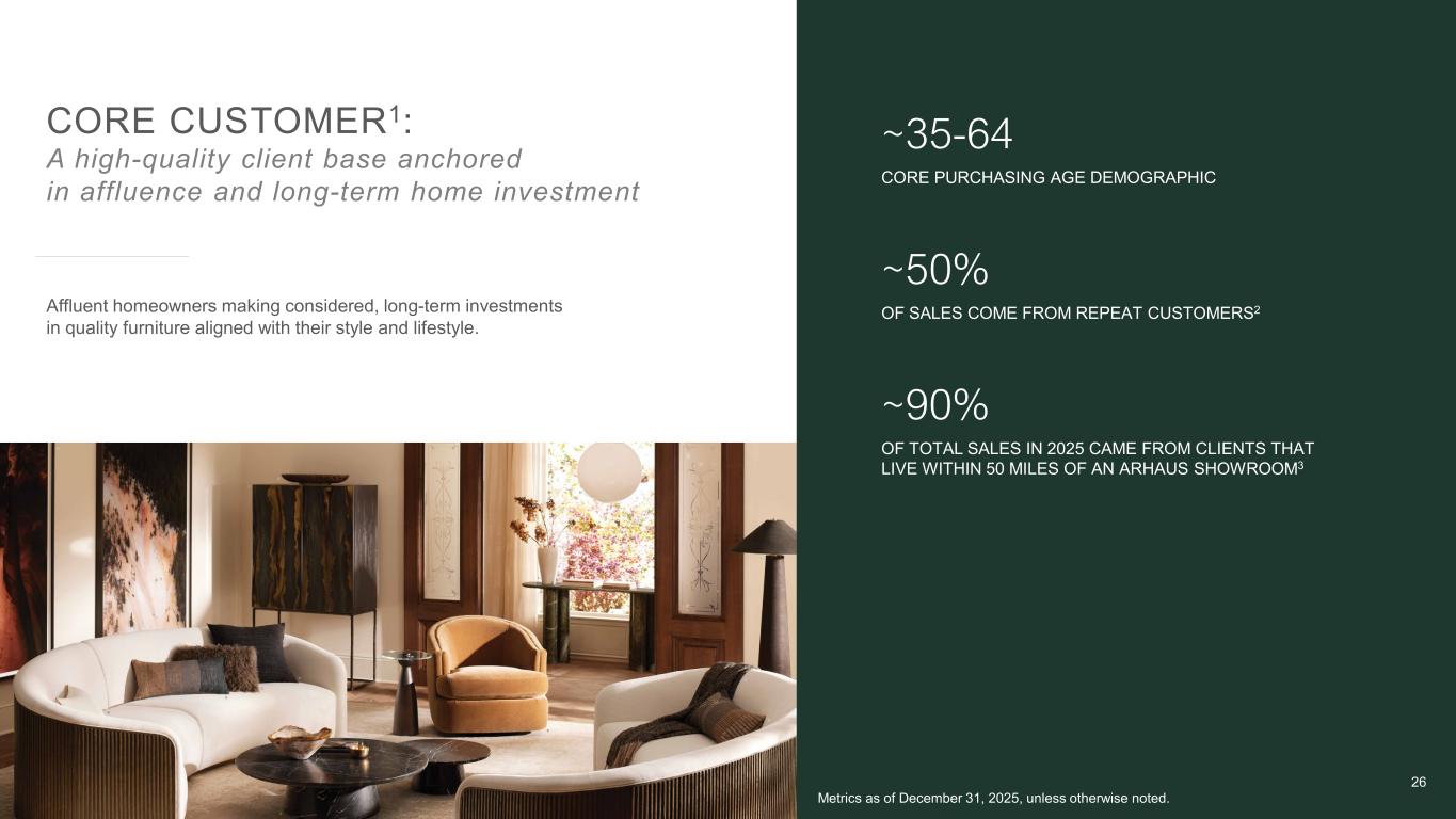 25 CORE CUSTOMER Affluent homeowners making considered decisions, looking for quality furniture reflecting their style and lifestyle ARHAUS INTERIOR DESIGN PROGRAM Designer-assisted projects generally see AOV’s over four times that of a standard order, higher repeat purchasing behavior, and increased visibility into future projects TRADE High-Growth Professional Partners with Planned, Visible Demand and Repeat, Project-Based Spend BRAND FOUNDATION Arhaus’ Growth Tapestry anchors our customer mix, with a fully integrated omni-channel model woven throughout to drive engagement, conversion, and loyalty WE WIN ACROSS CHANNELS2 Aesthetic / Design Premium Quality Value Service Website Experience Location Designer Recommendations Attribute Arhaus Opportunity Strong Runway for Expansion OUR 3 CUSTOMER DEMAND CHANNELS ARE SUPPORTED BY ARHAUS’ GROWTH TAPESTRY1 Our customer mix includes our core customer, customers that work with our Arhaus interior designers, and Trade. Growth Tapestry Product, Showrooms, Brand Awareness & Client Engagement, Disciplined Investment