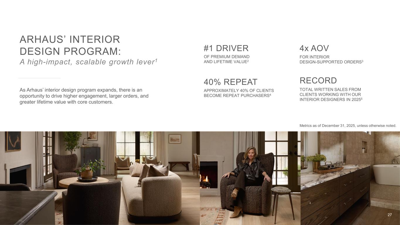 CORE CUSTOMER1: A high-quality client base anchored in affluence and long-term home investment ~35-64 CORE PURCHASING AGE DEMOGRAPHIC ~50% OF SALES COME FROM REPEAT CUSTOMERS2 ~90% OF TOTAL SALES IN 2025 CAME FROM CLIENTS THAT LIVE WITHIN 50 MILES OF AN ARHAUS SHOWROOM3 Affluent homeowners making considered, long-term investments in quality furniture aligned with their style and lifestyle. Metrics as of December 31, 2025, unless otherwise noted. 26