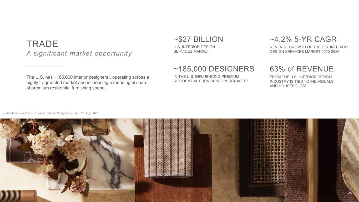 Total Market Source: IBISWorld, Interior Designers in the US, July 2025. ~185,000 DESIGNERS IN THE U.S. INFLUENCING PREMIUM RESIDENTIAL FURNISHING PURCHASES1 ~4.2% 5-YR CAGR REVENUE GROWTH OF THE U.S. INTERIOR DESIGN SERVICES MARKET 2020-20251 63% of REVENUE FROM THE U.S. INTERIOR DESIGN INDUSTRY IS TIED TO INDIVIDUALS AND HOUSEHOLDS1 ~$27 BILLION U.S. INTERIOR DESIGN SERVICES MARKET1 28 TRADE A significant market opportunity The U.S. has ~185,000 interior designers1, operating across a highly fragmented market and influencing a meaningful share of premium residential furnishing spend.