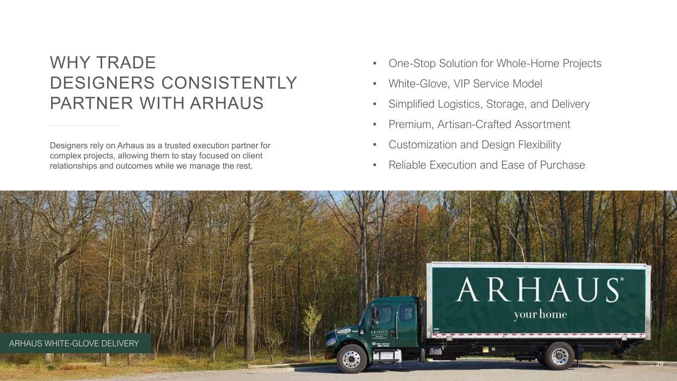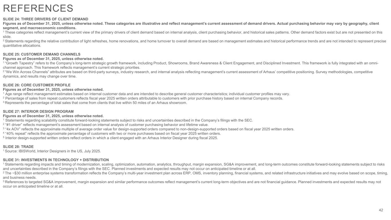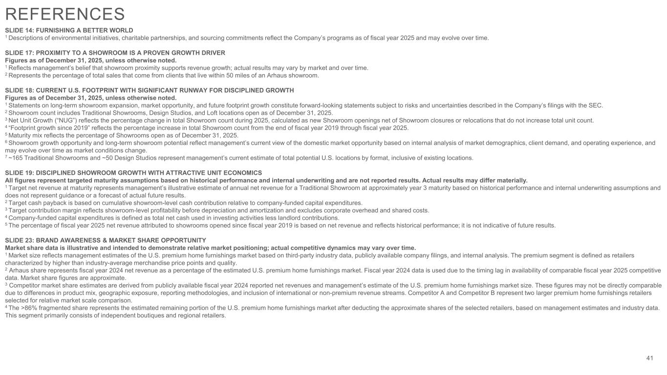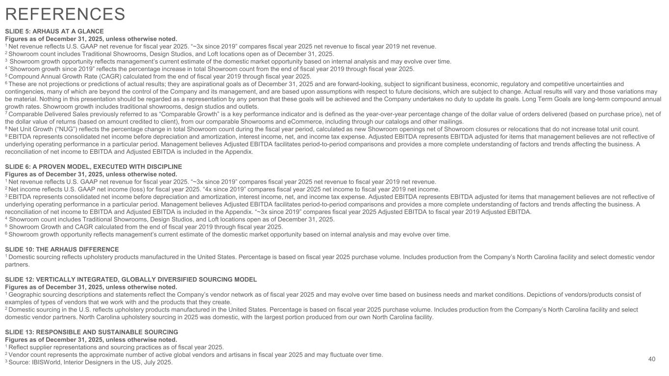 REFERENCES SLIDE 5: ARHAUS AT A GLANCE Figures as of December 31, 2025, unless otherwise noted. 1 Net revenue reflects U.S. GAAP net revenue for fiscal year 2025. “~3x since 2019” compares fiscal year 2025 net revenue to fiscal year 2019 net revenue. 2 Showroom count includes Traditional Showrooms, Design Studios, and Loft locations open as of December 31, 2025. 3 Showroom growth opportunity reflects management’s current estimate of the domestic market opportunity based on internal analysis and may evolve over time. 4 “Showroom growth since 2019” reflects the percentage increase in total Showroom count from the end of fiscal year 2019 through fiscal year 2025. 5 Compound Annual Growth Rate (CAGR) calculated from the end of fiscal year 2019 through fiscal year 2025. 6 These are not projections or predictions of actual results; they are aspirational goals as of December 31, 2025 and are forward-looking, subject to significant business, economic, regulatory and competitive uncertainties and contingencies, many of which are beyond the control of the Company and its management, and are based upon assumptions with respect to future decisions, which are subject to change. Actual results will vary and those variations may be material. Nothing in this presentation should be regarded as a representation by any person that these goals will be achieved and the Company undertakes no duty to update its goals. Long Term Goals are long-term compound annual growth rates. Showroom growth includes traditional showrooms, design studios and outlets. ​ 7 Comparable Delivered Sales previously referred to as “Comparable Growth” is a key performance indicator and is defined as the year-over-year percentage change of the dollar value of orders delivered (based on purchase price), net of the dollar value of returns (based on amount credited to client), from our comparable Showrooms and eCommerce, including through our catalogs and other mailings. 8 Net Unit Growth (“NUG”) reflects the percentage change in total Showroom count during the fiscal year period, calculated as new Showroom openings net of Showroom closures or relocations that do not increase total unit count. 9 EBITDA represents consolidated net income before depreciation and amortization, interest income, net, and income tax expense. Adjusted EBITDA represents EBITDA adjusted for items that management believes are not reflective of underlying operating performance in a particular period. Management believes Adjusted EBITDA facilitates period-to-period comparisons and provides a more complete understanding of factors and trends affecting the business. A reconciliation of net income to EBITDA and Adjusted EBITDA is included in the Appendix. SLIDE 6: A PROVEN MODEL, EXECUTED WITH DISCIPLINE Figures as of December 31, 2025, unless otherwise noted. 1 Net revenue reflects U.S. GAAP net revenue for fiscal year 2025. “~3x since 2019” compares fiscal year 2025 net revenue to fiscal year 2019 net revenue. 2 Net income reflects U.S. GAAP net income (loss) for fiscal year 2025. “4x since 2019” compares fiscal year 2025 net income to fiscal year 2019 net income. 3 EBITDA represents consolidated net income before depreciation and amortization, interest income, net, and income tax expense. Adjusted EBITDA represents EBITDA adjusted for items that management believes are not reflective of underlying operating performance in a particular period. Management believes Adjusted EBITDA facilitates period-to-period comparisons and provides a more complete understanding of factors and trends affecting the business. A reconciliation of net income to EBITDA and Adjusted EBITDA is included in the Appendix. “~3x since 2019” compares fiscal year 2025 Adjusted EBITDA to fiscal year 2019 Adjusted EBITDA. 4 Showroom count includes Traditional Showrooms, Design Studios, and Loft locations open as of December 31, 2025. 5 Showroom Growth and CAGR calculated from the end of fiscal year 2019 through fiscal year 2025. 6 Showroom growth opportunity reflects management’s current estimate of the domestic market opportunity based on internal analysis and may evolve over time. SLIDE 10: THE ARHAUS DIFFERENCE 1 Domestic sourcing reflects upholstery products manufactured in the United States. Percentage is based on fiscal year 2025 purchase volume. Includes production from the Company’s North Carolina facility and select domestic vendor partners. SLIDE 12: VERTICALLY INTEGRATED, GLOBALLY DIVERSIFIED SOURCING MODEL Figures as of December 31, 2025, unless otherwise noted. 1 Geographic sourcing descriptions and statements reflect the Company’s vendor network as of fiscal year 2025 and may evolve over time based on business needs and market conditions. Depictions of vendors/products consist of examples of types of vendors that we work with and the products that they create. 2 Domestic sourcing in the U.S. reflects upholstery products manufactured in the United States. Percentage is based on fiscal year 2025 purchase volume. Includes production from the Company’s North Carolina facility and select domestic vendor partners. North Carolina upholstery sourcing in 2025 was domestic, with the largest portion produced from our own North Carolina facility. SLIDE 13: RESPONSIBLE AND SUSTAINABLE SOURCING Figures as of December 31, 2025, unless otherwise noted. 1 Reflect supplier representations and sourcing practices as of fiscal year 2025. 2 Vendor count represents the approximate number of active global vendors and artisans in fiscal year 2025 and may fluctuate over time. 3 Source: IBISWorld, Interior Designers in the US, July 2025. 40