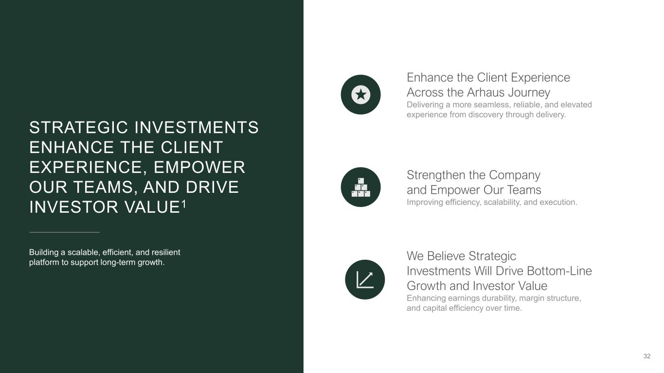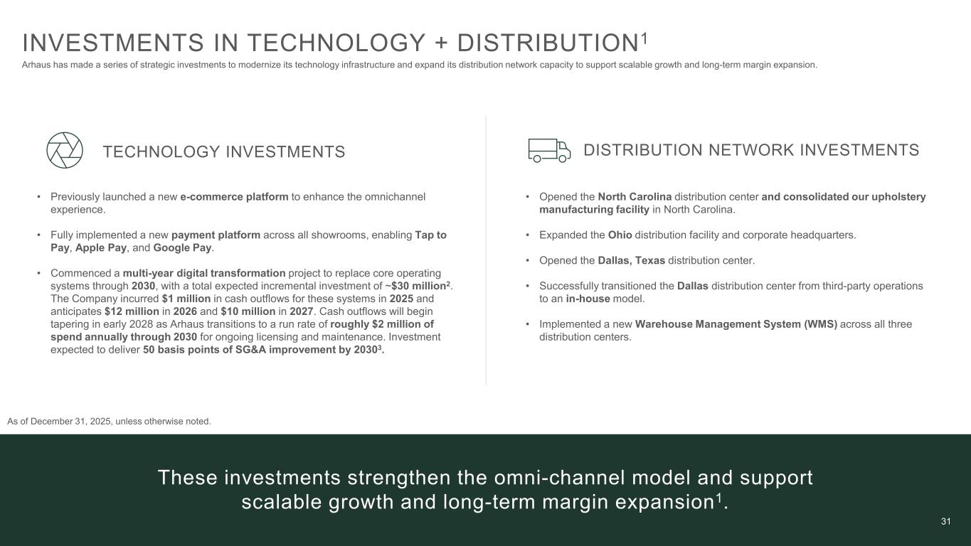 31 TECHNOLOGY INVESTMENTS • Previously launched a new e-commerce platform to enhance the omnichannel experience. • Fully implemented a new payment platform across all showrooms, enabling Tap to Pay, Apple Pay, and Google Pay. • Commenced a multi-year digital transformation project to replace core operating systems through 2030, with a total expected incremental investment of ~$30 million2. The Company incurred $1 million in cash outflows for these systems in 2025 and anticipates $12 million in 2026 and $10 million in 2027. Cash outflows will begin tapering in early 2028 as Arhaus transitions to a run rate of roughly $2 million of spend annually through 2030 for ongoing licensing and maintenance. Investment expected to deliver 50 basis points of SG&A improvement by 20303. • Opened the North Carolina distribution center and consolidated our upholstery manufacturing facility in North Carolina. • Expanded the Ohio distribution facility and corporate headquarters. • Opened the Dallas, Texas distribution center. • Successfully transitioned the Dallas distribution center from third-party operations to an in-house model. • Implemented a new Warehouse Management System (WMS) across all three distribution centers. These investments strengthen the omni-channel model and support scalable growth and long-term margin expansion1. INVESTMENTS IN TECHNOLOGY + DISTRIBUTION1 Arhaus has made a series of strategic investments to modernize its technology infrastructure and expand its distribution network capacity to support scalable growth and long-term margin expansion. As of December 31, 2025, unless otherwise noted. DISTRIBUTION NETWORK INVESTMENTS