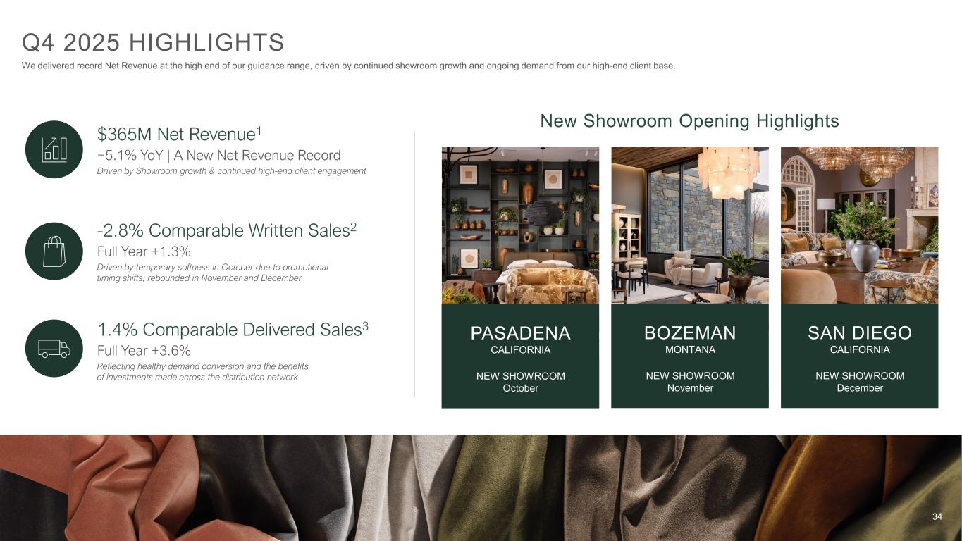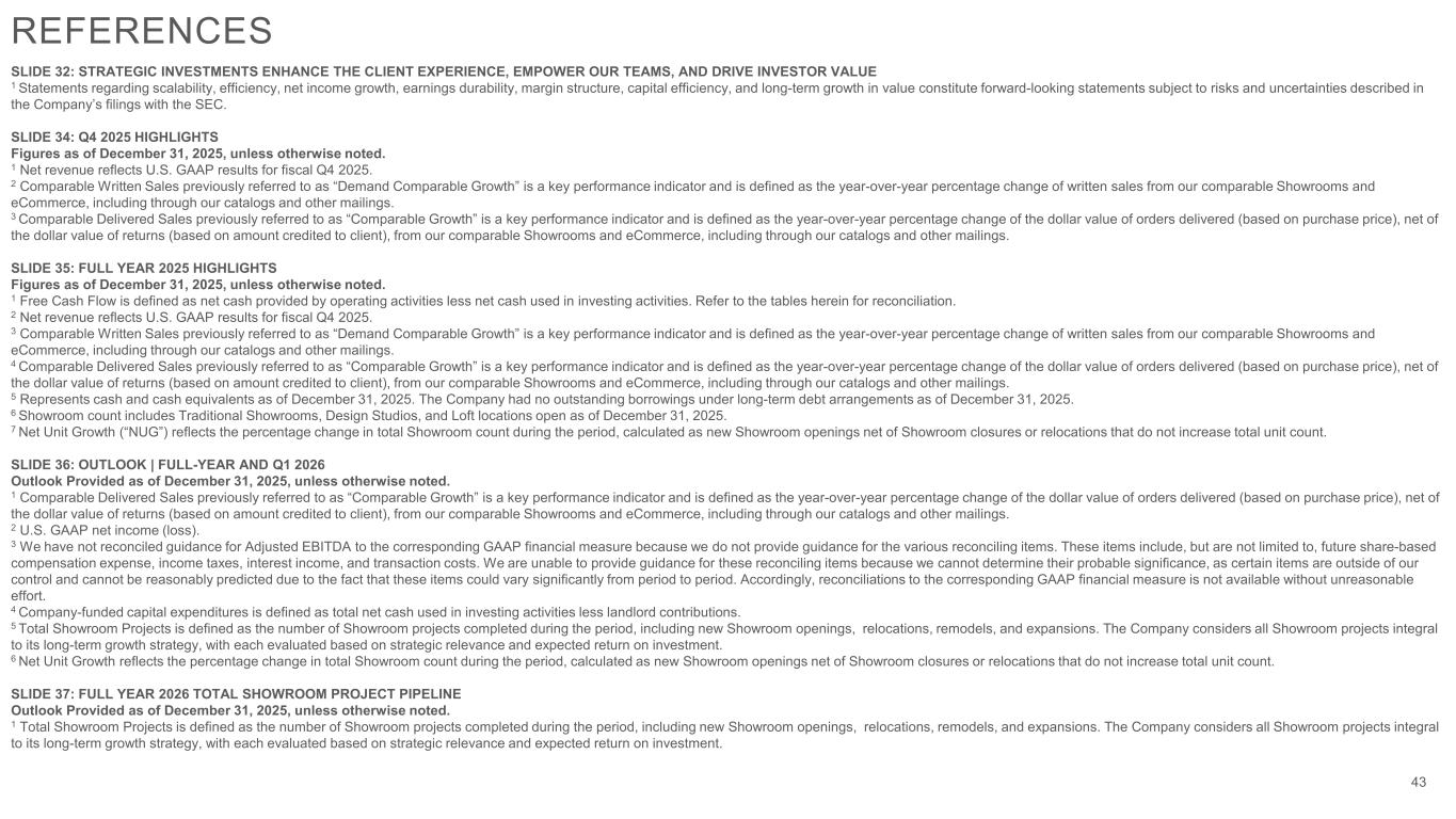 SLIDE 32: STRATEGIC INVESTMENTS ENHANCE THE CLIENT EXPERIENCE, EMPOWER OUR TEAMS, AND DRIVE INVESTOR VALUE 1 Statements regarding scalability, efficiency, net income growth, earnings durability, margin structure, capital efficiency, and long-term growth in value constitute forward-looking statements subject to risks and uncertainties described in the Company’s filings with the SEC. SLIDE 34: Q4 2025 HIGHLIGHTS Figures as of December 31, 2025, unless otherwise noted. 1 Net revenue reflects U.S. GAAP results for fiscal Q4 2025. 2 Comparable Written Sales previously referred to as “Demand Comparable Growth” is a key performance indicator and is defined as the year-over-year percentage change of written sales from our comparable Showrooms and eCommerce, including through our catalogs and other mailings. 3 Comparable Delivered Sales previously referred to as “Comparable Growth” is a key performance indicator and is defined as the year-over-year percentage change of the dollar value of orders delivered (based on purchase price), net of the dollar value of returns (based on amount credited to client), from our comparable Showrooms and eCommerce, including through our catalogs and other mailings. SLIDE 35: FULL YEAR 2025 HIGHLIGHTS Figures as of December 31, 2025, unless otherwise noted. 1 Free Cash Flow is defined as net cash provided by operating activities less net cash used in investing activities. Refer to the tables herein for reconciliation. 2 Net revenue reflects U.S. GAAP results for fiscal Q4 2025. 3 Comparable Written Sales previously referred to as “Demand Comparable Growth” is a key performance indicator and is defined as the year-over-year percentage change of written sales from our comparable Showrooms and eCommerce, including through our catalogs and other mailings. 4 Comparable Delivered Sales previously referred to as “Comparable Growth” is a key performance indicator and is defined as the year-over-year percentage change of the dollar value of orders delivered (based on purchase price), net of the dollar value of returns (based on amount credited to client), from our comparable Showrooms and eCommerce, including through our catalogs and other mailings. 5 Represents cash and cash equivalents as of December 31, 2025. The Company had no outstanding borrowings under long-term debt arrangements as of December 31, 2025. 6 Showroom count includes Traditional Showrooms, Design Studios, and Loft locations open as of December 31, 2025. 7 Net Unit Growth (“NUG”) reflects the percentage change in total Showroom count during the period, calculated as new Showroom openings net of Showroom closures or relocations that do not increase total unit count. SLIDE 36: OUTLOOK | FULL-YEAR AND Q1 2026 Outlook Provided as of December 31, 2025, unless otherwise noted. 1 Comparable Delivered Sales previously referred to as “Comparable Growth” is a key performance indicator and is defined as the year-over-year percentage change of the dollar value of orders delivered (based on purchase price), net of the dollar value of returns (based on amount credited to client), from our comparable Showrooms and eCommerce, including through our catalogs and other mailings. 2 U.S. GAAP net income (loss). 3 We have not reconciled guidance for Adjusted EBITDA to the corresponding GAAP financial measure because we do not provide guidance for the various reconciling items. These items include, but are not limited to, future share-based compensation expense, income taxes, interest income, and transaction costs. We are unable to provide guidance for these reconciling items because we cannot determine their probable significance, as certain items are outside of our control and cannot be reasonably predicted due to the fact that these items could vary significantly from period to period. Accordingly, reconciliations to the corresponding GAAP financial measure is not available without unreasonable effort. 4 Company-funded capital expenditures is defined as total net cash used in investing activities less landlord contributions. 5 Total Showroom Projects is defined as the number of Showroom projects completed during the period, including new Showroom openings, relocations, remodels, and expansions. The Company considers all Showroom projects integral to its long-term growth strategy, with each evaluated based on strategic relevance and expected return on investment. 6 Net Unit Growth reflects the percentage change in total Showroom count during the period, calculated as new Showroom openings net of Showroom closures or relocations that do not increase total unit count. SLIDE 37: FULL YEAR 2026 TOTAL SHOWROOM PROJECT PIPELINE Outlook Provided as of December 31, 2025, unless otherwise noted. 1 Total Showroom Projects is defined as the number of Showroom projects completed during the period, including new Showroom openings, relocations, remodels, and expansions. The Company considers all Showroom projects integral to its long-term growth strategy, with each evaluated based on strategic relevance and expected return on investment. 43 REFERENCES