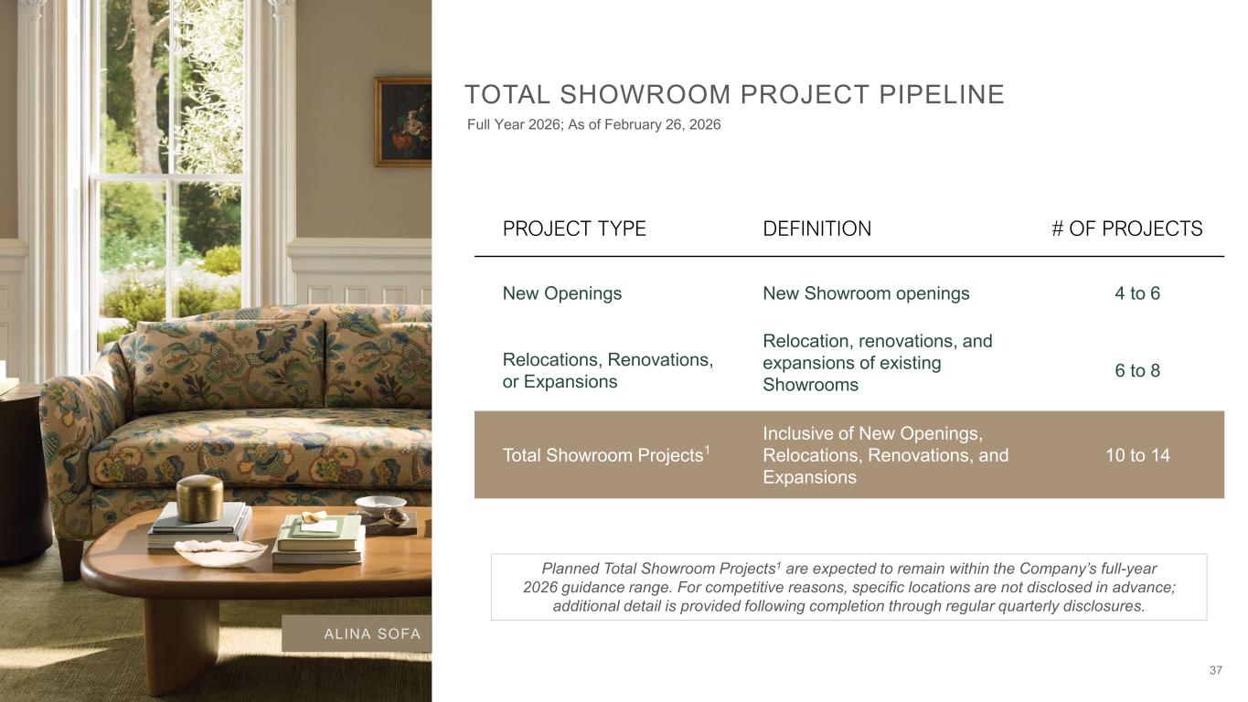 37 PROJECT TYPE DEFINITION # OF PROJECTS New Openings New Showroom openings 4 to 6 Relocations, Renovations, or Expansions Relocation, renovations, and expansions of existing Showrooms 6 to 8 Total Showroom Projects1 Inclusive of New Openings, Relocations, Renovations, and Expansions 10 to 14 TOTAL SHOWROOM PROJECT PIPELINE Planned Total Showroom Projects1 are expected to remain within the Company’s full-year 2026 guidance range. For competitive reasons, specific locations are not disclosed in advance; additional detail is provided following completion through regular quarterly disclosures. ALINA SOFA Full Year 2026; As of February 26, 2026