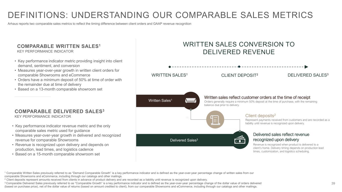 39 COMPARABLE WRITTEN SALES1 KEY PERFORMANCE INDICATOR COMPARABLE DELIVERED SALES3 KEY PERFORMANCE INDICATOR • Key performance indicator metric providing insight into client demand, sentiment, and conversion • Measures year-over-year growth in written client orders for comparable Showrooms and eCommerce • Orders have a minimum deposit of 50% at time of order with the remainder due at time of delivery • Based on a 13-month comparable showroom set • Key performance indicator revenue metric and the only comparable sales metric used for guidance • Measures year-over-year growth in delivered and recognized revenue for comparable Showrooms • Revenue is recognized upon delivery and depends on production, lead times, and logistics cadence • Based on a 15-month comparable showroom set WRITTEN SALES CONVERSION TO DELIVERED REVENUE WRITTEN SALES1 DELIVERED SALES3 Written sales reflect customer orders at the time of receipt Orders generally require a minimum 50% deposit at the time of purchase, with the remaining balance due prior to delivery. Written Sales1 Delivered Sales3 Delivered sales reflect revenue recognized upon delivery Revenue is recognized when product is delivered to a client’s home. Delivery timing depends on production lead times, customization, and logistics scheduling. DEFINITIONS: UNDERSTANDING OUR COMPARABLE SALES METRICS Arhaus reports two comparable sales metrics to reflect the timing difference between client orders and GAAP revenue recognition 1 Comparable Written Sales previously referred to as “Demand Comparable Growth” is a key performance indicator and is defined as the year-over-year percentage change of written sales from our comparable Showrooms and eCommerce, including through our catalogs and other mailings. 2 Client deposits represent amounts received from clients in advance of product delivery and are recorded as a liability until revenue is recognized upon delivery. 3 Comparable Delivered Sales previously referred to as “Comparable Growth” is a key performance indicator and is defined as the year-over-year percentage change of the dollar value of orders delivered (based on purchase price), net of the dollar value of returns (based on amount credited to client), from our comparable Showrooms and eCommerce, including through our catalogs and other mailings. CLIENT DEPOSIT2 Client deposits2 Represent payments received from customers and are recorded as a liability until revenue is recognized upon delivery.