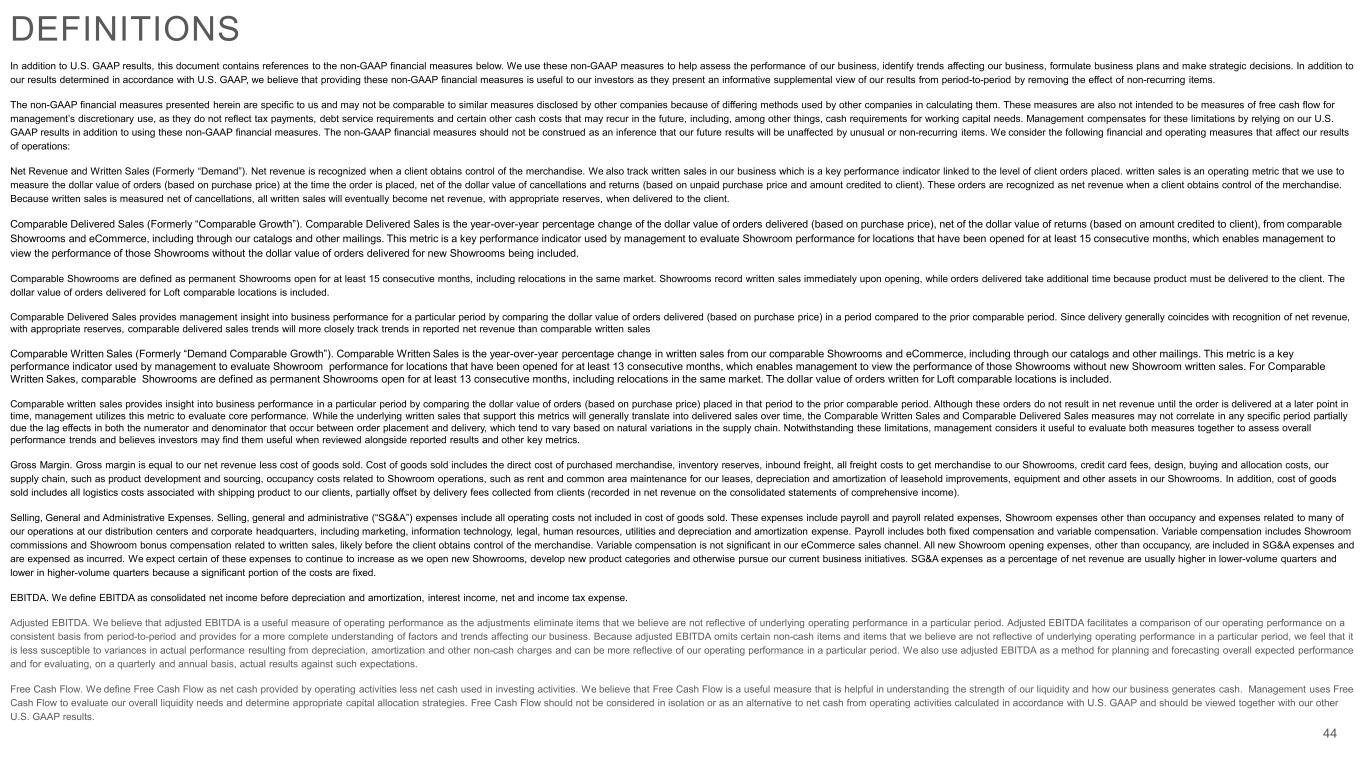 In addition to U.S. GAAP results, this document contains references to the non-GAAP financial measures below. We use these non-GAAP measures to help assess the performance of our business, identify trends affecting our business, formulate business plans and make strategic decisions. In addition to our results determined in accordance with U.S. GAAP, we believe that providing these non-GAAP financial measures is useful to our investors as they present an informative supplemental view of our results from period-to-period by removing the effect of non-recurring items. The non-GAAP financial measures presented herein are specific to us and may not be comparable to similar measures disclosed by other companies because of differing methods used by other companies in calculating them. These measures are also not intended to be measures of free cash flow for management’s discretionary use, as they do not reflect tax payments, debt service requirements and certain other cash costs that may recur in the future, including, among other things, cash requirements for working capital needs. Management compensates for these limitations by relying on our U.S. GAAP results in addition to using these non-GAAP financial measures. The non-GAAP financial measures should not be construed as an inference that our future results will be unaffected by unusual or non-recurring items. We consider the following financial and operating measures that affect our results of operations: Net Revenue and Written Sales (Formerly “Demand”). Net revenue is recognized when a client obtains control of the merchandise. We also track written sales in our business which is a key performance indicator linked to the level of client orders placed. written sales is an operating metric that we use to measure the dollar value of orders (based on purchase price) at the time the order is placed, net of the dollar value of cancellations and returns (based on unpaid purchase price and amount credited to client). These orders are recognized as net revenue when a client obtains control of the merchandise. Because written sales is measured net of cancellations, all written sales will eventually become net revenue, with appropriate reserves, when delivered to the client. Comparable Delivered Sales (Formerly “Comparable Growth”). Comparable Delivered Sales is the year-over-year percentage change of the dollar value of orders delivered (based on purchase price), net of the dollar value of returns (based on amount credited to client), from comparable Showrooms and eCommerce, including through our catalogs and other mailings. This metric is a key performance indicator used by management to evaluate Showroom performance for locations that have been opened for at least 15 consecutive months, which enables management to view the performance of those Showrooms without the dollar value of orders delivered for new Showrooms being included. Comparable Showrooms are defined as permanent Showrooms open for at least 15 consecutive months, including relocations in the same market. Showrooms record written sales immediately upon opening, while orders delivered take additional time because product must be delivered to the client. The dollar value of orders delivered for Loft comparable locations is included. Comparable Delivered Sales provides management insight into business performance for a particular period by comparing the dollar value of orders delivered (based on purchase price) in a period compared to the prior comparable period. Since delivery generally coincides with recognition of net revenue, with appropriate reserves, comparable delivered sales trends will more closely track trends in reported net revenue than comparable written sales Comparable Written Sales (Formerly “Demand Comparable Growth”). Comparable Written Sales is the year-over-year percentage change in written sales from our comparable Showrooms and eCommerce, including through our catalogs and other mailings. This metric is a key performance indicator used by management to evaluate Showroom performance for locations that have been opened for at least 13 consecutive months, which enables management to view the performance of those Showrooms without new Showroom written sales. For Comparable Written Sakes, comparable Showrooms are defined as permanent Showrooms open for at least 13 consecutive months, including relocations in the same market. The dollar value of orders written for Loft comparable locations is included. Comparable written sales provides insight into business performance in a particular period by comparing the dollar value of orders (based on purchase price) placed in that period to the prior comparable period. Although these orders do not result in net revenue until the order is delivered at a later point in time, management utilizes this metric to evaluate core performance. While the underlying written sales that support this metrics will generally translate into delivered sales over time, the Comparable Written Sales and Comparable Delivered Sales measures may not correlate in any specific period partially due the lag effects in both the numerator and denominator that occur between order placement and delivery, which tend to vary based on natural variations in the supply chain. Notwithstanding these limitations, management considers it useful to evaluate both measures together to assess overall performance trends and believes investors may find them useful when reviewed alongside reported results and other key metrics. Gross Margin. Gross margin is equal to our net revenue less cost of goods sold. Cost of goods sold includes the direct cost of purchased merchandise, inventory reserves, inbound freight, all freight costs to get merchandise to our Showrooms, credit card fees, design, buying and allocation costs, our supply chain, such as product development and sourcing, occupancy costs related to Showroom operations, such as rent and common area maintenance