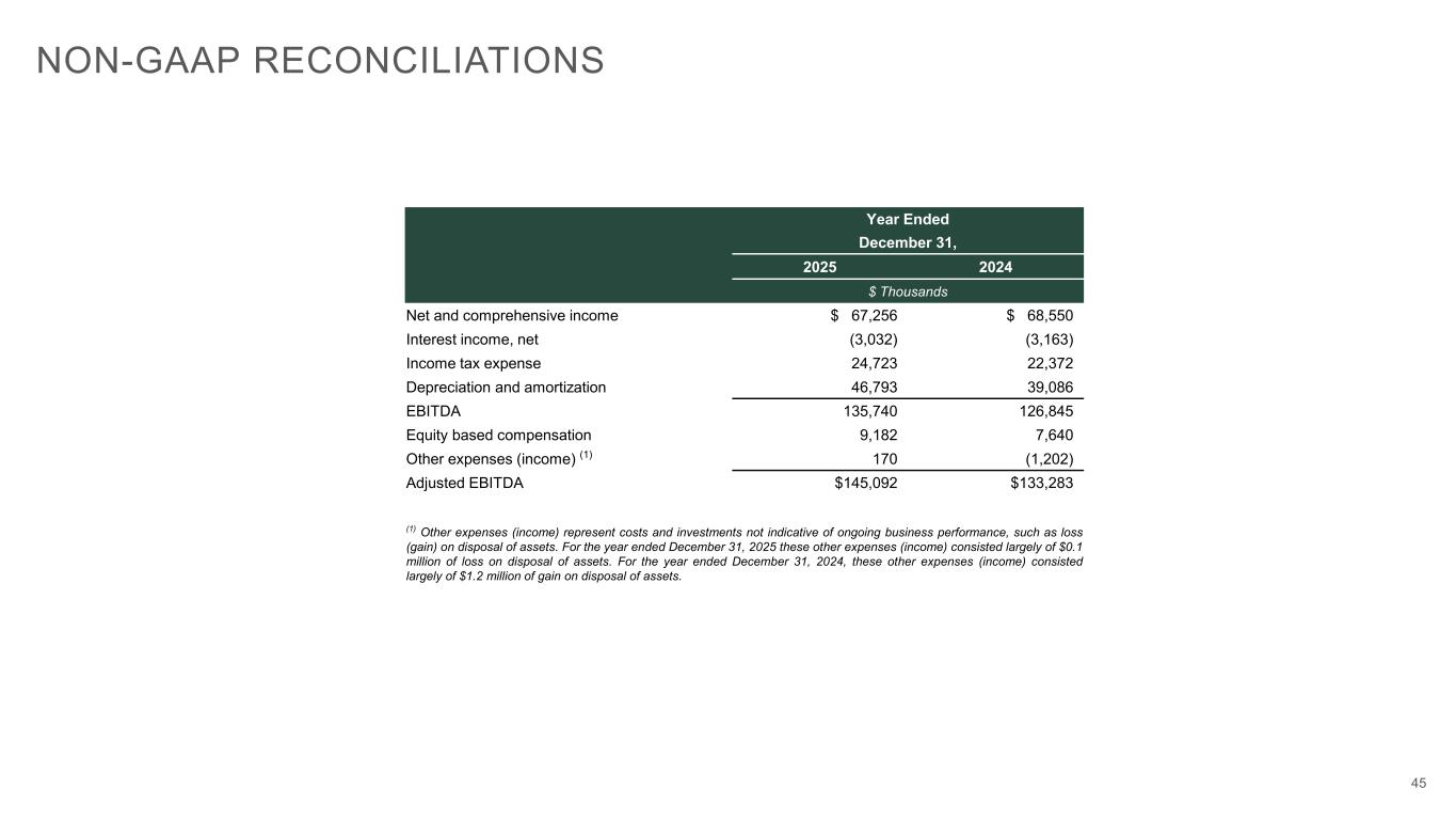 45 Year Ended December 31, 2025 2024 $ Thousands Net and comprehensive income $ 67,256 $ 68,550 Interest income, net (3,032) (3,163) Income tax expense 24,723 22,372 Depreciation and amortization 46,793 39,086 EBITDA 135,740 126,845 Equity based compensation 9,182 7,640 Other expenses (income) (1) 170 (1,202) Adjusted EBITDA $145,092 $133,283 (1) Other expenses (income) represent costs and investments not indicative of ongoing business performance, such as loss (gain) on disposal of assets. For the year ended December 31, 2025 these other expenses (income) consisted largely of $0.1 million of loss on disposal of assets. For the year ended December 31, 2024, these other expenses (income) consisted largely of $1.2 million of gain on disposal of assets. NON-GAAP RECONCILIATIONS