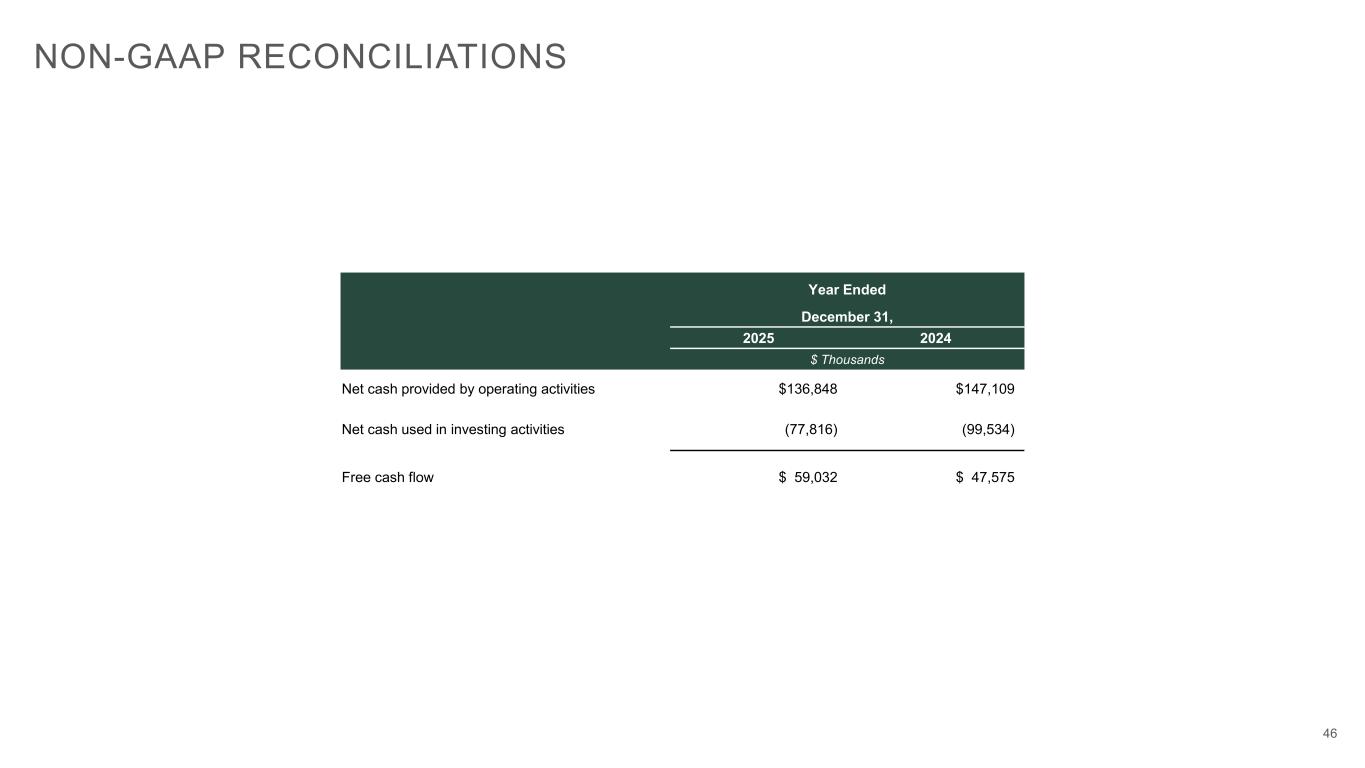 46 Year Ended December 31, 2025 2024 $ Thousands Net cash provided by operating activities $136,848 $147,109 Net cash used in investing activities (77,816) (99,534) Free cash flow $ 59,032 $ 47,575 NON-GAAP RECONCILIATIONS