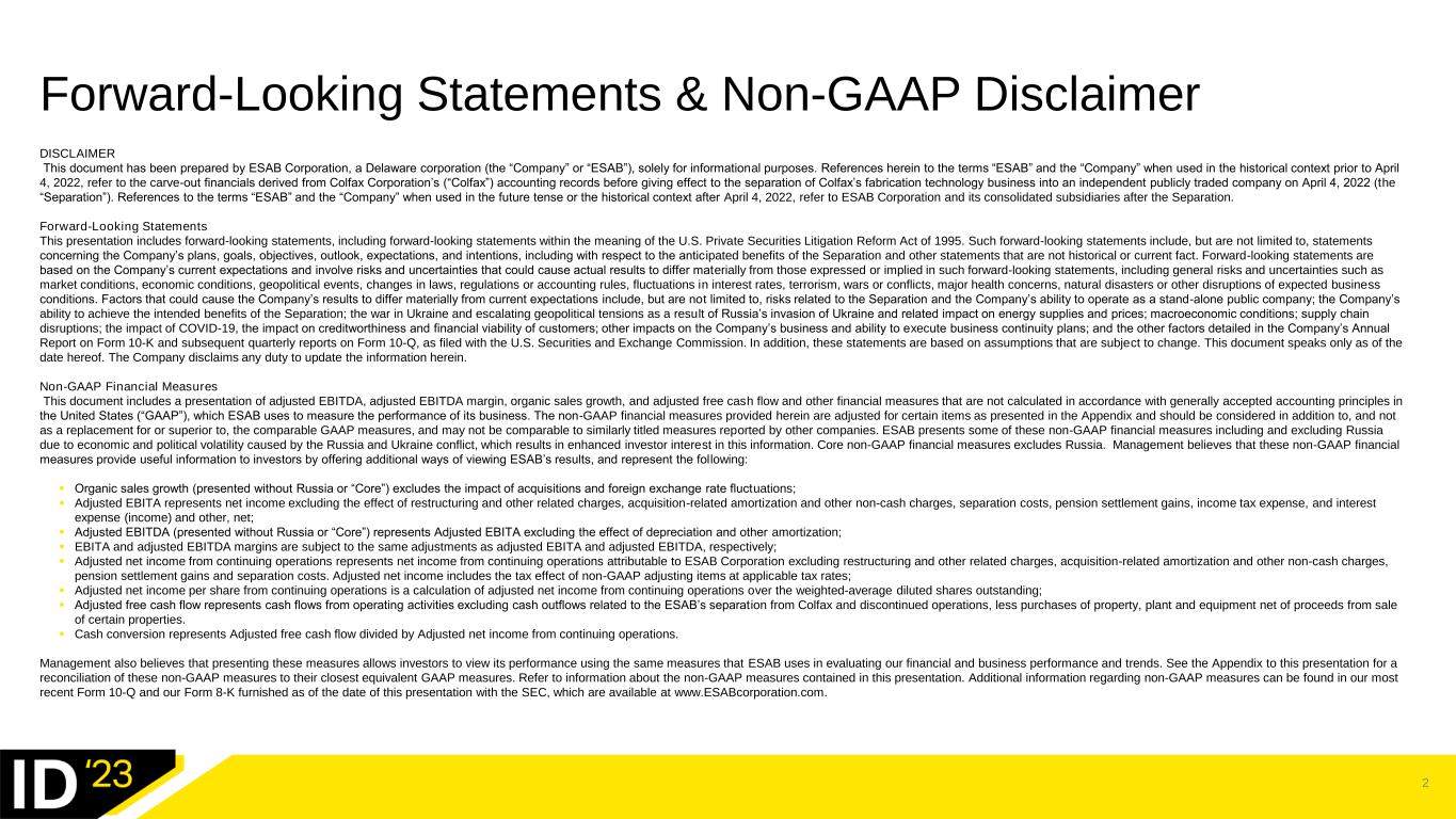 Forward-Looking Statements & Non-GAAP Disclaimer 2 DISCLAIMER This document has been prepared by ESAB Corporation, a Delaware corporation (the “Company” or “ESAB”), solely for informational purposes. References herein to the terms “ESAB” and the “Company” when used in the historical context prior to April 4, 2022, refer to the carve-out financials derived from Colfax Corporation’s (“Colfax”) accounting records before giving effect to the separation of Colfax’s fabrication technology business into an independent publicly traded company on April 4, 2022 (the “Separation”). References to the terms “ESAB” and the “Company” when used in the future tense or the historical context after April 4, 2022, refer to ESAB Corporation and its consolidated subsidiaries after the Separation. Forward-Looking Statements This presentation includes forward-looking statements, including forward-looking statements within the meaning of the U.S. Private Securities Litigation Reform Act of 1995. Such forward-looking statements include, but are not limited to, statements concerning the Company’s plans, goals, objectives, outlook, expectations, and intentions, including with respect to the anticipated benefits of the Separation and other statements that are not historical or current fact. Forward-looking statements are based on the Company’s current expectations and involve risks and uncertainties that could cause actual results to differ materially from those expressed or implied in such forward-looking statements, including general risks and uncertainties such as market conditions, economic conditions, geopolitical events, changes in laws, regulations or accounting rules, fluctuations in interest rates, terrorism, wars or conflicts, major health concerns, natural disasters or other disruptions of expected business conditions. Factors that could cause the Company’s results to differ materially from current expectations include, but are not limited to, risks related to the Separation and the Company’s ability to operate as a stand-alone public company; the Company’s ability to achieve the intended benefits of the Separation; the war in Ukraine and escalating geopolitical tensions as a result of Russia’s invasion of Ukraine and related impact on energy supplies and prices; macroeconomic conditions; supply chain disruptions; the impact of COVID-19, the impact on creditworthiness and financial viability of customers; other impacts on the Company’s business and ability to execute business continuity plans; and the other factors detailed in the Company’s Annual Report on Form 10-K and subsequent quarterly reports on Form 10-Q, as filed with the U.S. Securities and Exchange Commission. In addition, these statements are based on assumptions that are subject to change. This document speaks only as of the date hereof. The Company disclaims any duty to update the information herein. Non-GAAP Financial Measures This document includes a presentation of adjusted EBITDA, adjusted EBITDA margin, organic sales growth, and adjusted free cash flow and other financial measures that are not calculated in accordance with generally accepted accounting principles in the United States (“GAAP”), which ESAB uses to measure the performance of its business. The non-GAAP financial measures provided herein are adjusted for certain items as presented in the Appendix and should be considered in addition to, and not as a replacement for or superior to, the comparable GAAP measures, and may not be comparable to similarly titled measures reported by other companies. ESAB presents some of these non-GAAP financial measures including and excluding Russia due to economic and political volatility caused by the Russia and Ukraine conflict, which results in enhanced investor interest in this information. Core non-GAAP financial measures excludes Russia. Management believes that these non-GAAP financial measures provide useful information to investors by offering additional ways of viewing ESAB’s results, and represent the following: ▪ Organic sales growth (presented without Russia or “Core”) excludes the impact of acquisitions and foreign exchange rate fluctuations; ▪ Adjusted EBITA represents net income excluding the effect of restructuring and other related charges, acquisition-related amortization and other non-cash charges, separation costs, pension settlement gains, income tax expense, and interest expense (income) and other, net; ▪ Adjusted EBITDA (presented without Russia or “Core”) represents Adjusted EBITA excluding the effect of depreciation and other amortization; ▪ EBITA and adjusted EBITDA margins are subject to the same adjustments as adjusted EBITA and adjusted EBITDA, respectively; ▪ Adjusted net income from continuing operations represents net income from continuing operations attributable to ESAB Corporation excluding restructuring and other related charges, acquisition-related amortization and other non-cash charges, pension settlement gains and separation costs. Adjusted net income includes the tax effect of non-GAAP adjusting items at applicable tax rates; ▪ Adjusted net income per share from continuing operations is a calculation of adjusted net income from continuing operations over the weighted-average diluted shares outstanding; ▪ Adjusted free cash flow represents cash flows from operating activities excluding cash outflows related to the ESAB’s separation from Colfax and discontinued operations, less purchases of property, plant and equipment net of proceeds from sale of certain properties. ▪ Cash conversion represents Adjusted free cash flow divided by Adjusted net income from continuing operations. Management also believes that presenting these measures allows investors to view its performance using the same measures that ESAB uses in evaluating our financial and business performance and trends. See the Appendix to this presentation for a recon