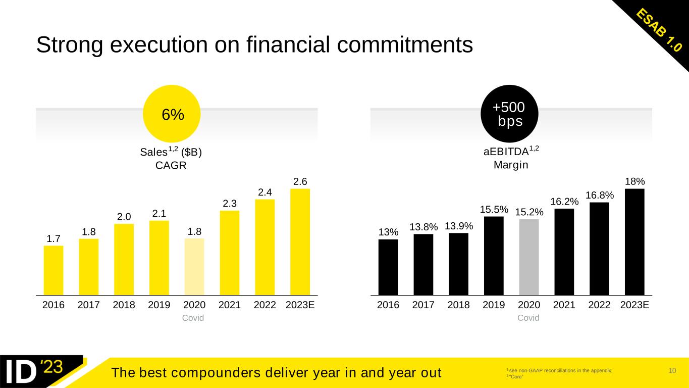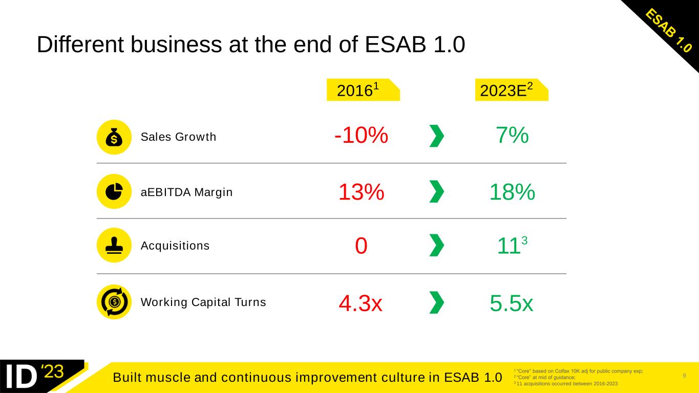 Different business at the end of ESAB 1.0 Built muscle and continuous improvement culture in ESAB 1.0 9 13%aEBITDA Margin -10%Sales Growth 4.3xWorking Capital Turns 0Acquisitions 18% 7% 5.5x 113 1 “Core” based on Colfax 10K adj for public company exp; 2 “Core” at mid of guidance; 3 11 acquisitions occurred between 2016-2023 20161 2023E2