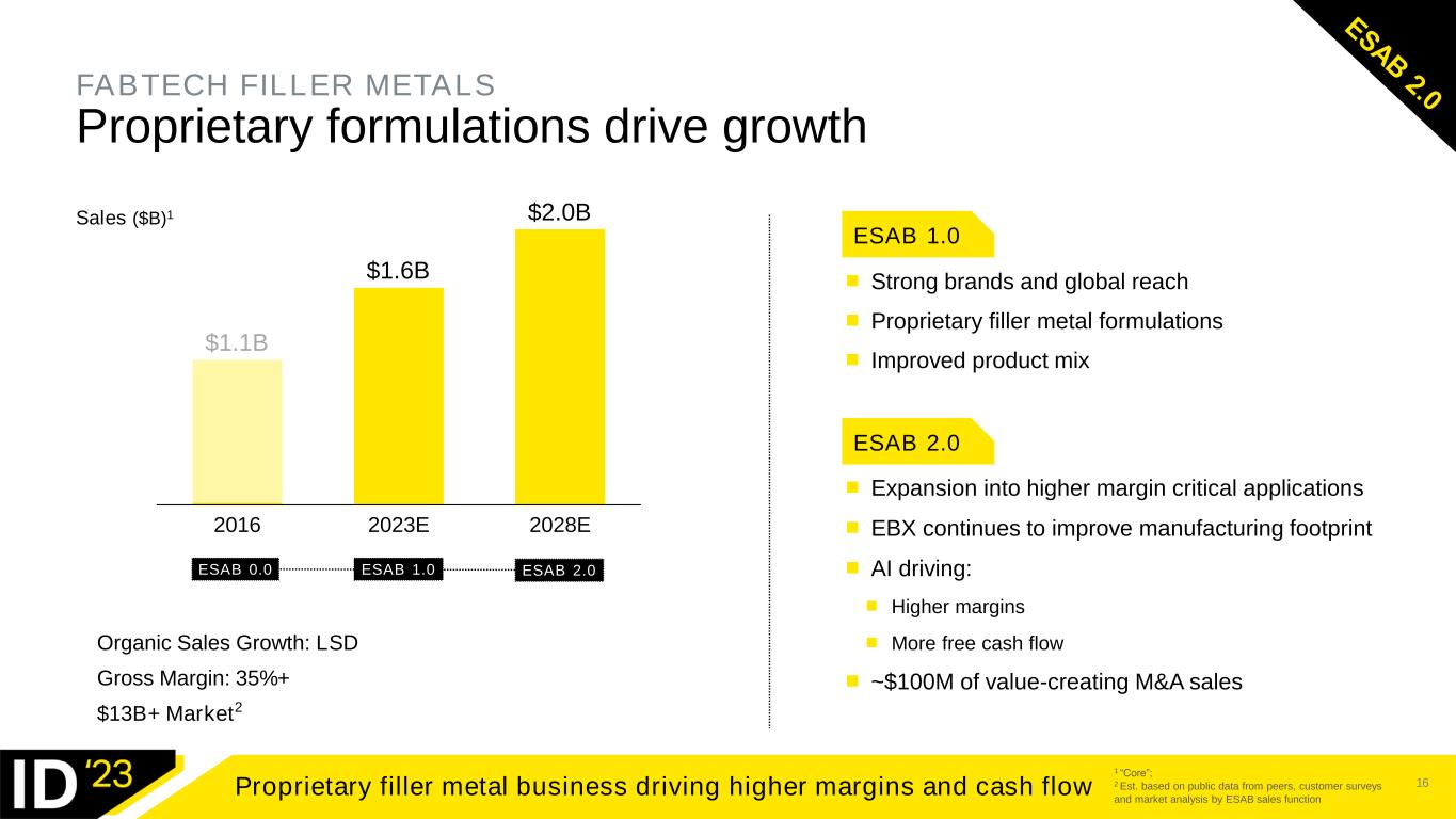ESAB 2.0, 2024 – 2028 Creating a focused premier industrial compounder Less cyclicality, higher margins & strong cash flow 15 aEBITDA % 18% $2.6B 22%+ Accelerate share gain Increase differentiated automation solutions Complete manufacturing footprint optimization Continue to add technology to drive competitive advantage >$2B of FCF generated for value creating sales $4.0B CAPABILITIES WE’VE BUILT ALLOW US TO: 17% 60% 23% 2023E2 49% 26% 25% 2028E2 13% $1.7B 62% 28% 10% 20161 ESAB 0.0 ESAB 2.0ESAB 1.0 1 see non-GAAP reconciliations in the appendix; 2 “Core” Gas Equipment Automation & Equipment Filler Metals Sales