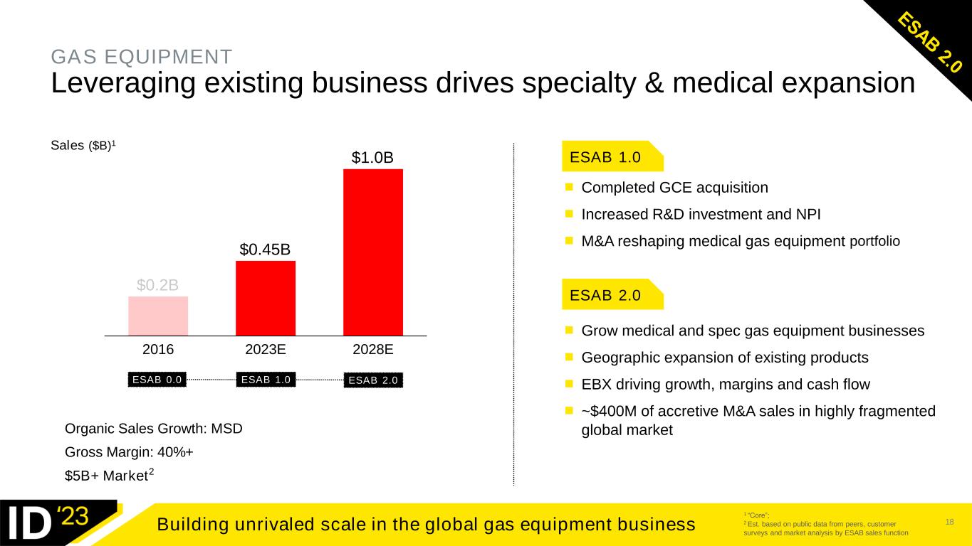 FABTECH AUTOMATION & EQUIPMENT Focused on growth, margins and less cyclicality Cutting-edge equipment and automation solutions fueling growth 17 ▪ Market share gain with Next-Gen equipment ▪ Cobots expanding automation TAM ▪ Will embed AI to improve the business ▪ ~$200M of value-creating M&A sales 2016 2023E 2028E $0.6B $1.0B $0.5B Sales ($B)1 Organic Sales Growth: MSD–HSD Gross Margin: 40%+ $12B+ Market2 ▪ “Leap frogged” equipment line & digital solutions ▪ Introduced market-leading cobot solution ▪ Developed adaptive automation solution ▪ Focused on less capital-intensive automation ESAB 1.0 ESAB 2.0 ESAB 0.0 ESAB 2.0ESAB 1.0 1 “Core”; 2 Est. based on public data from peers, customer surveys and market analysis by ESAB sales function