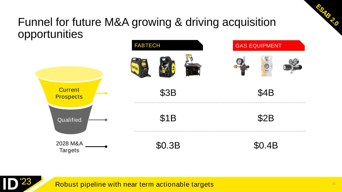 Recent M&A activity driving growth & reducing cyclicality Strategic M&A accelerating favorable product mix 20 2023E Sales Growth% ESAB Base1 Acquisitions 6% 9%+ 300bps+ ESAB Base1 Acquisitions 36% 40%+ 400bps+ RECENT M&A PERFORMANCE VS. ESAB BASE 2023E Gross Margin % Less Cyclicality Higher Margin Automation Solution TAM Expansion A & E G C G a s E q u ip m e n t STRATEGIC CRITERIA 1 “Core”