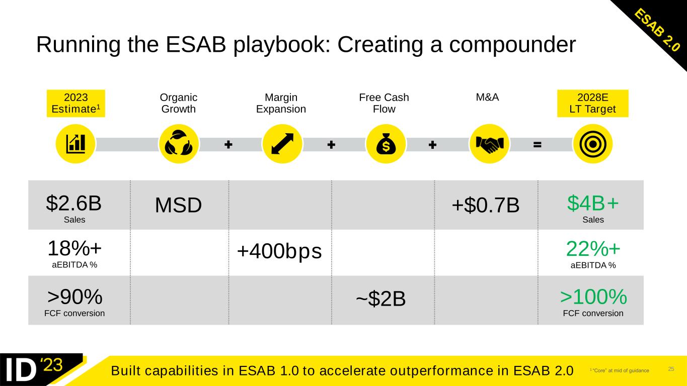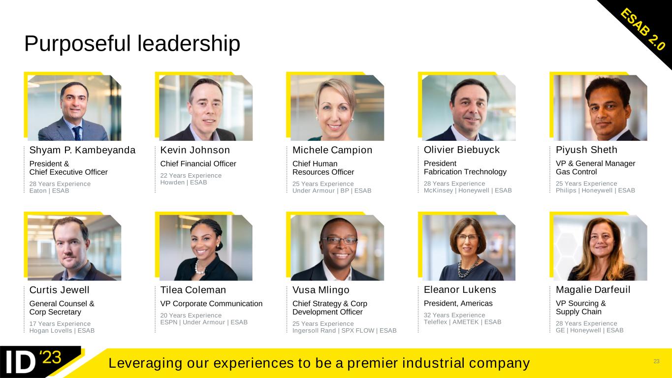 Expanding ESAB’s total addressable markets Creating new avenues for growth in our core areas of expertise 22 $8 $5 $2 $13 $12 $5 $15 $17 $8 $40B Filler Metals Automation & Equipment Gas Equipment $30B $15B HOW WE ARE EXPANDING THE TAM Bolt-on acquisitions Innovative products and solutions Geographic expansion of existing product lines TAM1 ($B) 2016 2023E 2024 – ’28 ESAB 0.0 ESAB 2.0ESAB 1.0 1 Est. based on public data from peers, customer surveys and market analysis by ESAB sales function