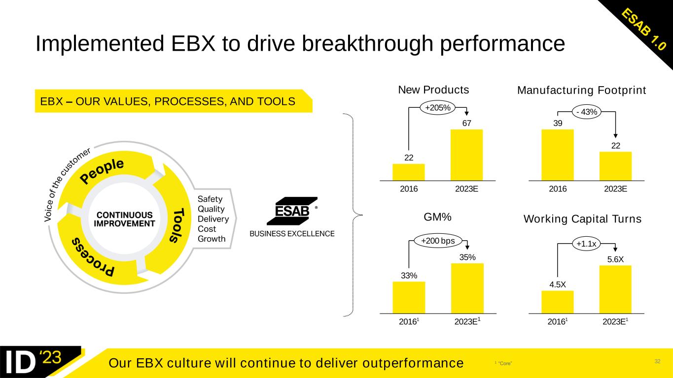 Fabtech 2016: A challenged business with great potential Addressing 2016 challenges created runway for breakthroughs 31 Focused on high-margin specialty and high-alloy filler metal Limited innovation Aged portfolio in Automation & Equipment and losing share Limited pricing discipline 22 manufacturing plants Implemented pricing discipline Developed connected equipment & automation workflow solutions 39 sub-scale manufacturing plants Lack of focus on differentiation Revamped equipment line-up for distributors 2016 2023E