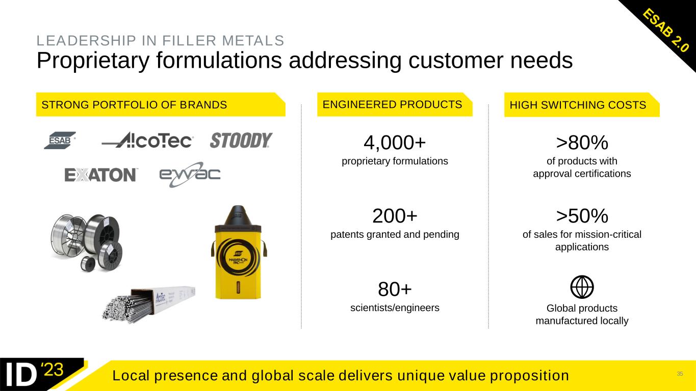 Fabtech 2024 – 2028: Accelerating growth & margins Well positioned to deliver further growth and margin expansion 34 Gross Margin 31% 20161 73% 27% 69% 65% 35% 2028E22023E2 Automation & Equipment Filler Metals Sales $2.2B $1.5B ~$3.0B 33% 35% 38% Deploy EBX to drive manufacturing and commercial excellence Capture demand for automation and workflow solutions Gain market share with innovative equipment Expand filler metal (FM) leadership ESAB 0.0 ESAB 2.0ESAB 1.0 CAPABILITIES WE’VE BUILT ALLOW US TO: 1 “Core” based on Colfax 10K; 2 “Core”