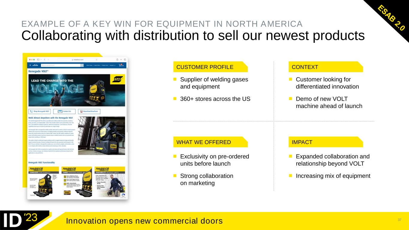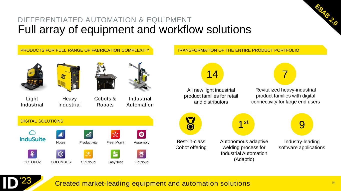 DIFFERENTIATED AUTOMATION & EQUIPMENT Full array of equipment and workflow solutions Created market-leading equipment and automation solutions 36 All new light industrial product families for retail and distributors Revitalized heavy-industrial product families with digital connectivity for large end users Notes Productivity AssemblyFleet Mgmt OCTOPUZ COLUMBUS CutCloud EasyNest FloCloud PRODUCTS FOR FULL RANGE OF FABRICATION COMPLEXITY TRANSFORMATION OF THE ENTIRE PRODUCT PORTFOLIO Light Industrial Heavy Industrial Cobots & Robots Industrial Automation 14 7 Autonomous adaptive welding process for Industrial Automation (Adaptio) 1st Industry-leading software applications 9 DIGITAL SOLUTIONS Best-in-class Cobot offering