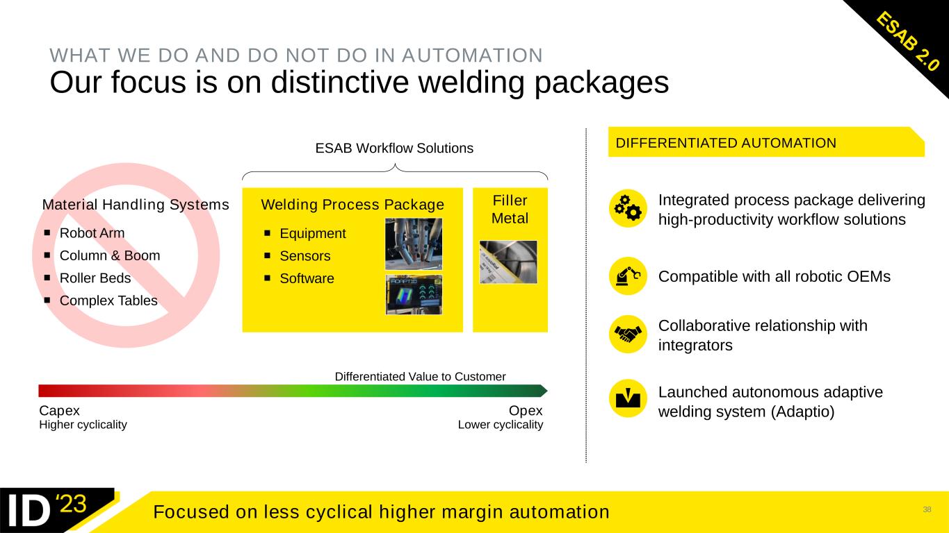 WHAT WE DO AND DO NOT DO IN AUTOMATION Our focus is on distinctive welding packages Focused on less cyclical higher margin automation 38 Welding Process PackageMaterial Handling Systems Integrated process package delivering high-productivity workflow solutions Capex Higher cyclicality Opex Lower cyclicality ▪ Equipment ▪ Sensors ▪ Software Filler Metal ▪ Robot Arm ▪ Column & Boom ▪ Roller Beds ▪ Complex Tables Compatible with all robotic OEMs Collaborative relationship with integrators Launched autonomous adaptive welding system (Adaptio) ESAB Workflow Solutions DIFFERENTIATED AUTOMATION Differentiated Value to Customer
