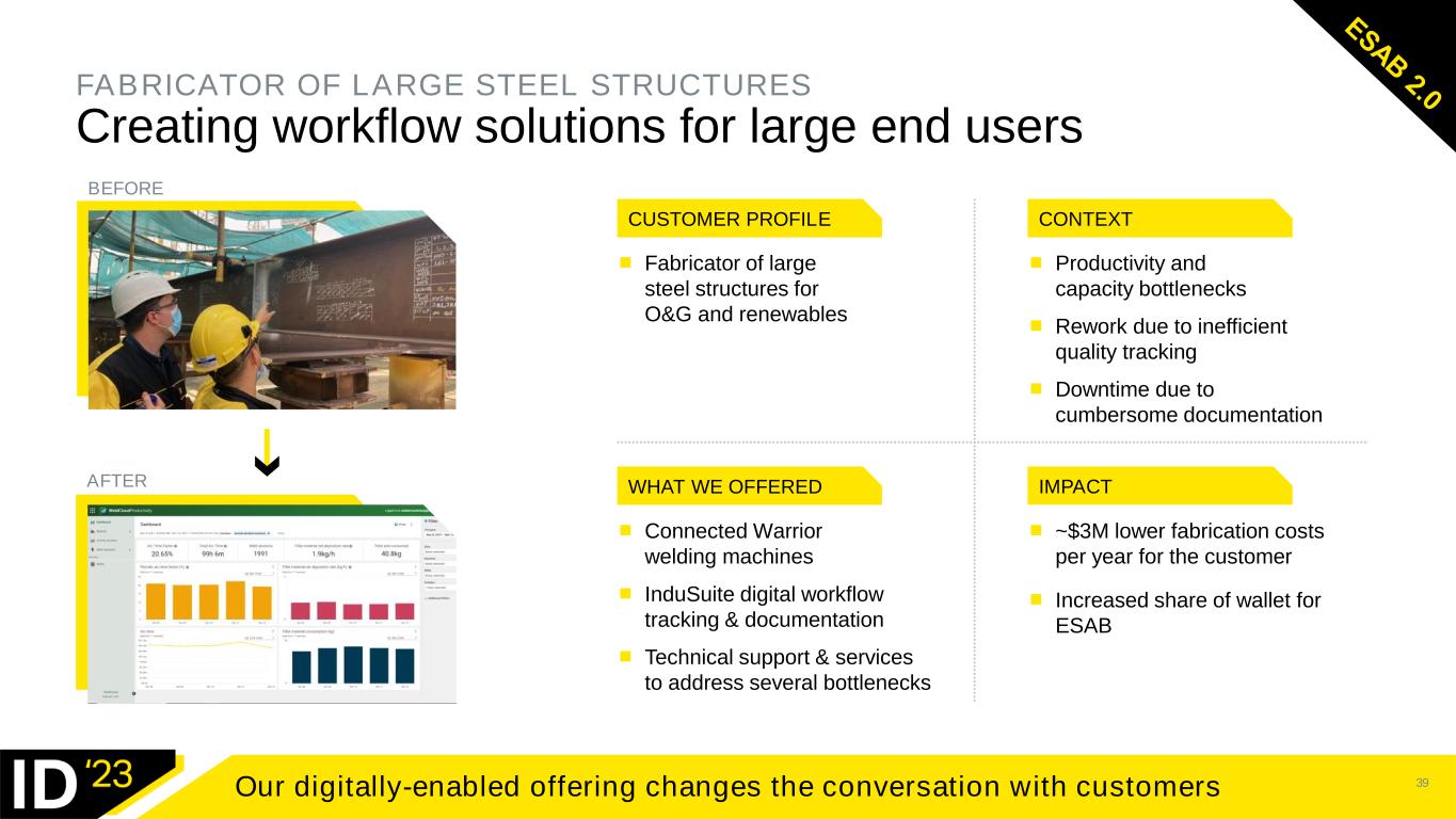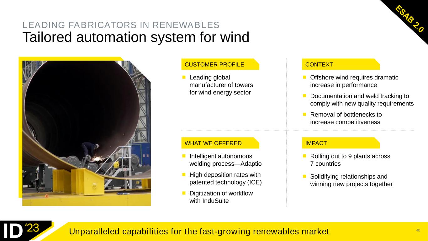 FABRICATOR OF LARGE STEEL STRUCTURES Creating workflow solutions for large end users Our digitally-enabled offering changes the conversation with customers 39 BEFORE AFTER ▪ Fabricator of large steel structures for O&G and renewables ▪ Connected Warrior welding machines ▪ InduSuite digital workflow tracking & documentation ▪ Technical support & services to address several bottlenecks ▪ Productivity and capacity bottlenecks ▪ Rework due to inefficient quality tracking ▪ Downtime due to cumbersome documentation ▪ ~$3M lower fabrication costs per year for the customer ▪ Increased share of wallet for ESAB CUSTOMER PROFILE CONTEXT IMPACTWHAT WE OFFERED