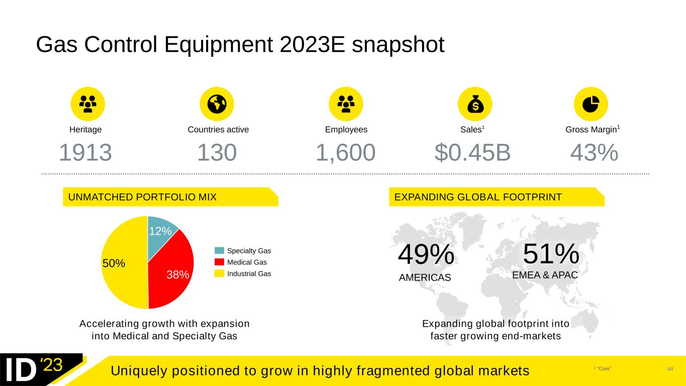 Gas Control Equipment 2023E snapshot Uniquely positioned to grow in highly fragmented global markets 44 $0.45B Sales1 1,600 Employees 130 Countries active AMERICAS EMEA & APAC 49% 51% EXPANDING GLOBAL FOOTPRINT 12% 38% 50% UNMATCHED PORTFOLIO MIX Specialty Gas Medical Gas Industrial Gas Expanding global footprint into faster growing end-markets Accelerating growth with expansion into Medical and Specialty Gas 1913 Heritage 43% Gross Margin1 1 “Core”
