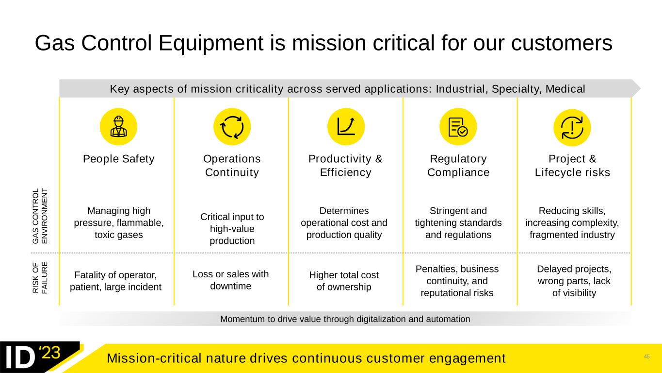 Gas Control Equipment is mission critical for our customers Mission-critical nature drives continuous customer engagement 45 People Safety Project & Lifecycle risks Regulatory Compliance Productivity & Efficiency Operations Continuity G A S C O N T R O L E N V IR O N M E N T Managing high pressure, flammable, toxic gases Fatality of operator, patient, large incident Critical input to high-value production Stringent and tightening standards and regulations Loss or sales with downtime Penalties, business continuity, and reputational risks Reducing skills, increasing complexity, fragmented industry Delayed projects, wrong parts, lack of visibility Determines operational cost and production quality Higher total cost of ownershipR IS K O F F A IL U R E Key aspects of mission criticality across served applications: Industrial, Specialty, Medical Momentum to drive value through digitalization and automation