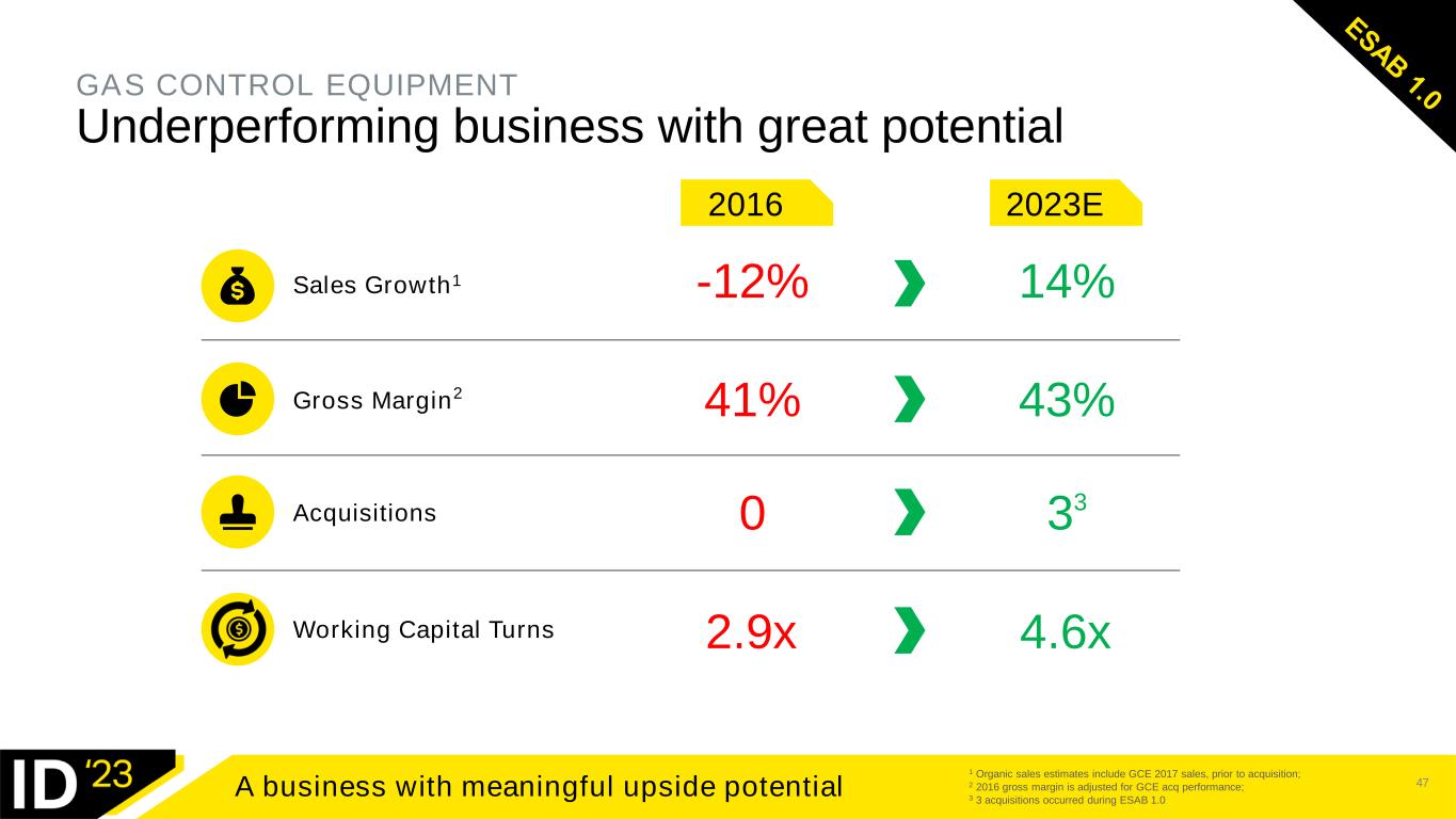 GAS CONTROL EQUIPMENT Underperforming business with great potential A business with meaningful upside potential 47 41% -12% 2.9x 0 43% 14% 4.6x 33 Gross Margin2 Sales Growth1 Working Capital Turns Acquisitions 2016 2023E 1 Organic sales estimates include GCE 2017 sales, prior to acquisition; 2 2016 gross margin is adjusted for GCE acq performance; 3 3 acquisitions occurred during ESAB 1.0