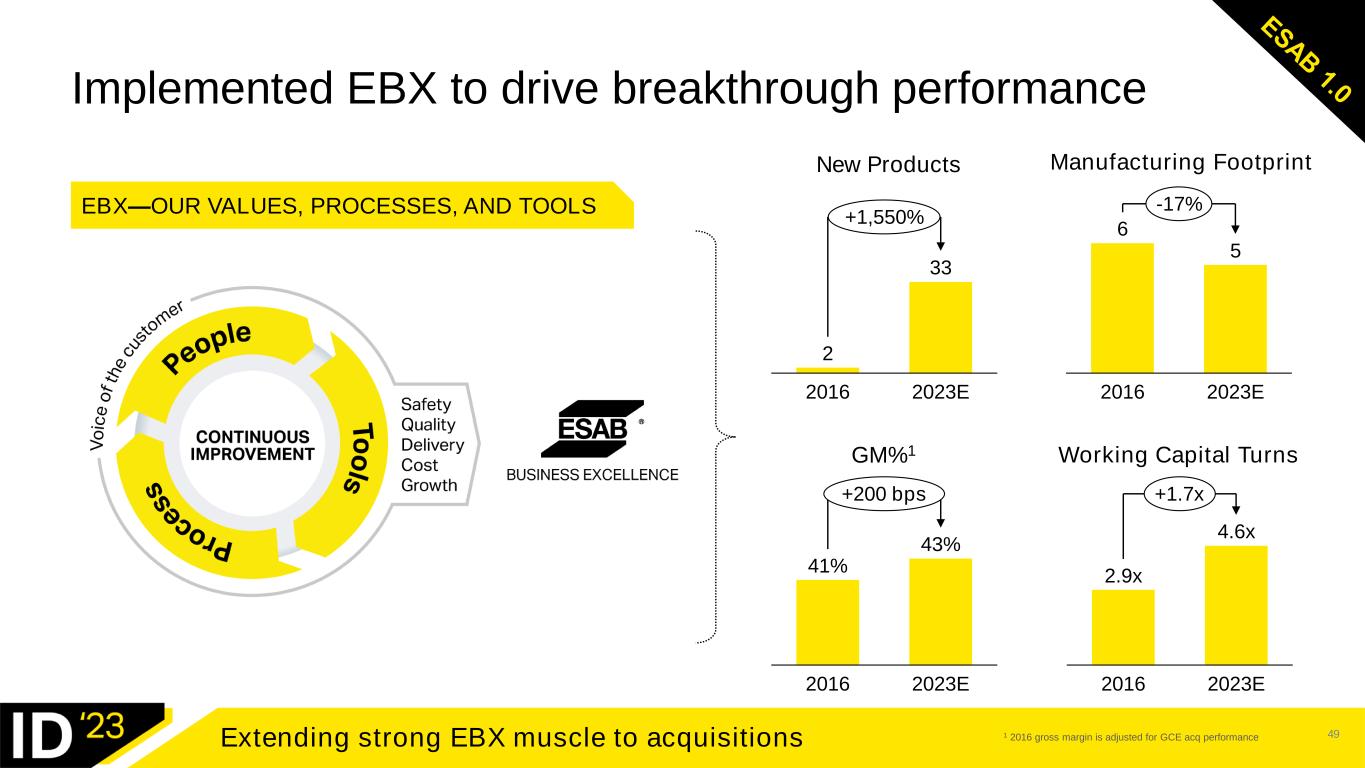GAS CONTROL EQUIPMENT Building the foundation EBX and successful acquisitions created a solid foundation in ESAB 1.0 48 Growing globally Industrial gas equipment focused Poor operations & pricing discipline Limited R&D investment Completed GCE, Ohio & Therapy acq. Expanding to specialty & medical gas Deployed EBX & net pricing discipline No acquisitions in Gas Control Niche regionally focused Accelerated innovation 2016 2023E