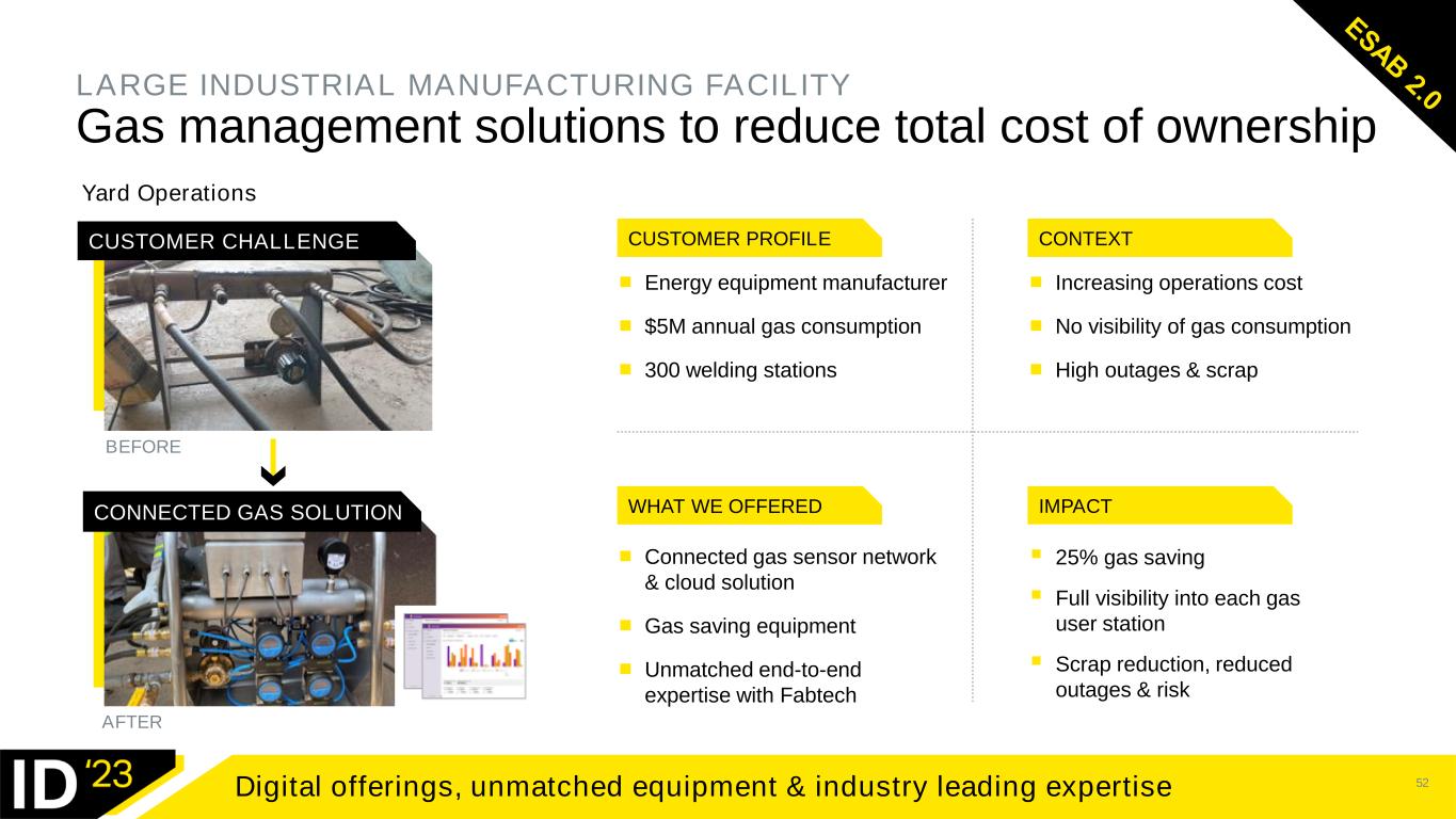 LARGE INDUSTRIAL MANUFACTURING FACILITY Gas management solutions to reduce total cost of ownership Digital offerings, unmatched equipment & industry leading expertise 52 ▪ Energy equipment manufacturer ▪ $5M annual gas consumption ▪ 300 welding stations ▪ Increasing operations cost ▪ No visibility of gas consumption ▪ High outages & scrap ▪ 25% gas saving ▪ Full visibility into each gas user station ▪ Scrap reduction, reduced outages & risk ▪ Connected gas sensor network & cloud solution ▪ Gas saving equipment ▪ Unmatched end-to-end expertise with Fabtech Yard Operations CUSTOMER PROFILE CONTEXT IMPACTWHAT WE OFFEREDCONNECTED GAS SOLUTION CUSTOMER CHALLENGE BEFORE AFTER