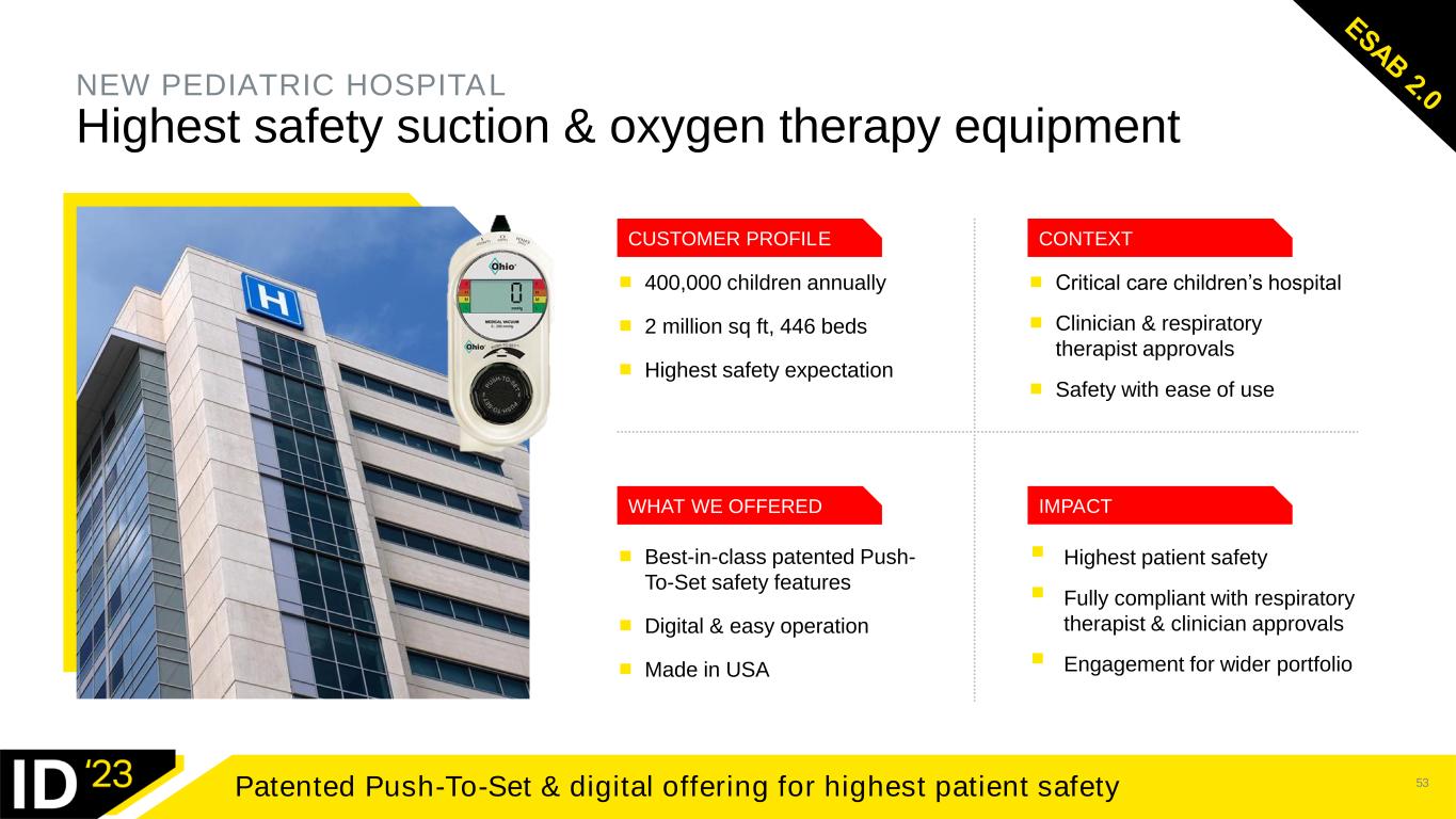 NEW PEDIATRIC HOSPITAL Highest safety suction & oxygen therapy equipment Patented Push-To-Set & digital offering for highest patient safety 53 ▪ 400,000 children annually ▪ 2 million sq ft, 446 beds ▪ Highest safety expectation ▪ Critical care children’s hospital ▪ Clinician & respiratory therapist approvals ▪ Safety with ease of use ▪ Highest patient safety ▪ Fully compliant with respiratory therapist & clinician approvals ▪ Engagement for wider portfolio ▪ Best-in-class patented Push- To-Set safety features ▪ Digital & easy operation ▪ Made in USA CUSTOMER PROFILE CONTEXT IMPACTWHAT WE OFFERED