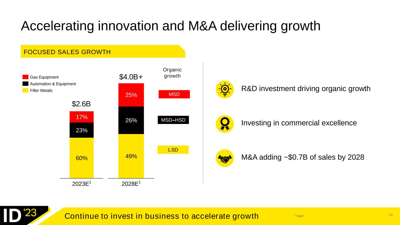 Accelerating innovation and M&A delivering growth Continue to invest in business to accelerate growth 59 R&D investment driving organic growth Investing in commercial excellence M&A adding ~$0.7B of sales by 2028 Organic growth LSD MSD–HSD MSD 23% 17% 60% 2023E1 $2.6B 49% 26% 25% 2028E1 $4.0B+ Filler Metals Automation & Equipment Gas Equipment FOCUSED SALES GROWTH 1 “Core”