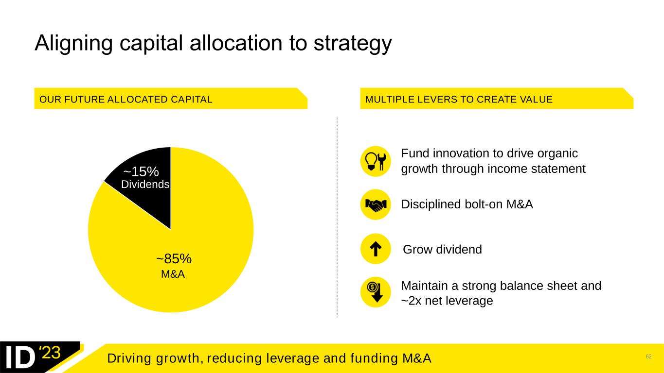 Aligning capital allocation to strategy​ Driving growth, reducing leverage and funding M&A 62 ~15% ~85% Dividends M&A Grow dividend Maintain a strong balance sheet and ~2x net leverage Disciplined bolt-on M&A Fund innovation to drive organic growth through income statement OUR FUTURE ALLOCATED CAPITAL MULTIPLE LEVERS TO CREATE VALUE