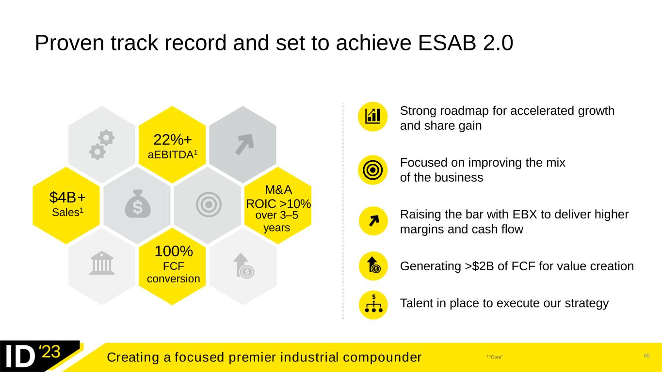 Proven track record and set to achieve ESAB 2.0 Creating a focused premier industrial compounder 65 Strong roadmap for accelerated growth and share gain Focused on improving the mix of the business Raising the bar with EBX to deliver higher margins and cash flow Generating >$2B of FCF for value creation Talent in place to execute our strategy $4B+ Sales1 100% FCF conversion 22%+ aEBITDA1 M&A ROIC >10% over 3–5 years 1 “Core”
