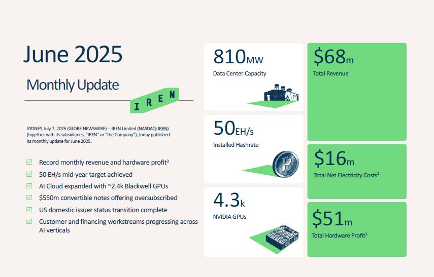 June 2025 Monthly Update 810MW Data Center Capacity SYDNEY, July 7, 2025 (GLOBE NEWSWIRE) -- IREN Limited (NASDAQ: IREN) (together with its subsidiaries, “IREN” or “the Company”), today published its monthly update for June 2025. 50EH/s Installed Hashrate R Record monthly revenue and hardware profit3 R 50 EH/s mid-year target achieved R AI Cloud expanded with ~2.4k Blackwell GPUs R $550m convertible notes offering oversubscribed  R US domestic issuer status transition complete R Customer and financing workstreams progressing across AI verticals 4.3k NVIDIA GPUs $68m Total Revenue $16m Total Net Electricity Costs1 $51m Total Hardware Profit3 Key Metrics Jun 25 May 25 Bitcoin Mining Average operating hashrate 41.1 EH/s 38.4 EH/s Bitcoin mined4620 BTC 627 BTC Revenue per Bitcoin mined $105,730 $103,345 Net electricity cost per Bitcoin mined2 ($26,259) ($27,033) Revenue $65.5m $64.7m Net electricity costs1 ($16.3m) ($16.9m) Hardware profit3 $49.2m $47.8m Hardware profit margin5 75% 74% AI Cloud Services Revenue $2.2m $2.2m Net electricity costs1 ($0.03m) ($0.03m) Hardware profit3 $2.1m$2.1m Hardware profit margin5 98% 98%