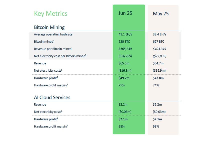 Hardware profit margin for Bitcoin Mining and AI Cloud Services is calculated as revenue less net electricity costs, divided by revenue (for each respective revenue stream) and excludes all other costs.
