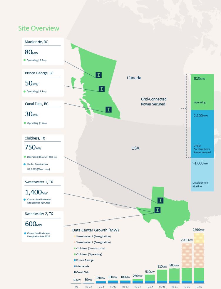 Site Overview Mackenzie, BC 80MW Operating | 5.2 EH/s  Prince George, BC 50MW Operating | 3.1 EH/s Canal Flats, BC 30MW Operating | 1.6 EH/s Childress, TX 750MW Operating (650MW) | 40.1 EH/s Under Construction H2 2025 (50MW  IT Load) Sweetwater 1, TX 1,400MW  Connection Underway Energization Apr 2026 Sweetwater 2, TX 600MW Connection Underway Energization Late 2027 Canada Grid-Connected Power Secured USA 810MW Operating 2,100MW Under Construction / Power secured >1,000MW Development Pipeline Data Center Growth (MW) 30MW 39MW 130MW 180MW 180MW 260MW 510MW 810MW 885MW 2,310MW 2,910MW Assumptions and Notes