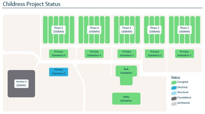 Childress Project Status Phase 5 (150MW) Phase 4 (150MW) Phase 1 (100MW) Phase 2 (100MW) Phase 3 (150MW) Primary Substation 5 Primary Substation 4 Primary Substation 1 Primary Substation 2 Primary Substation 3 Horizon 1 (50MW) Primary Substation 6 Bulk Substation Utility Substation Status Energized Electrical Structural Foundations Earthworks