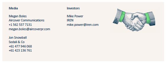 Media Megan Boles Aircover Communications +1 562 537 7131 megan.boles@aircoverpr.com Jon Snowball Sodali & Co +61 477 946 068 +61 423 136 761 Investors Mike Power IREN mike.power@iren.com