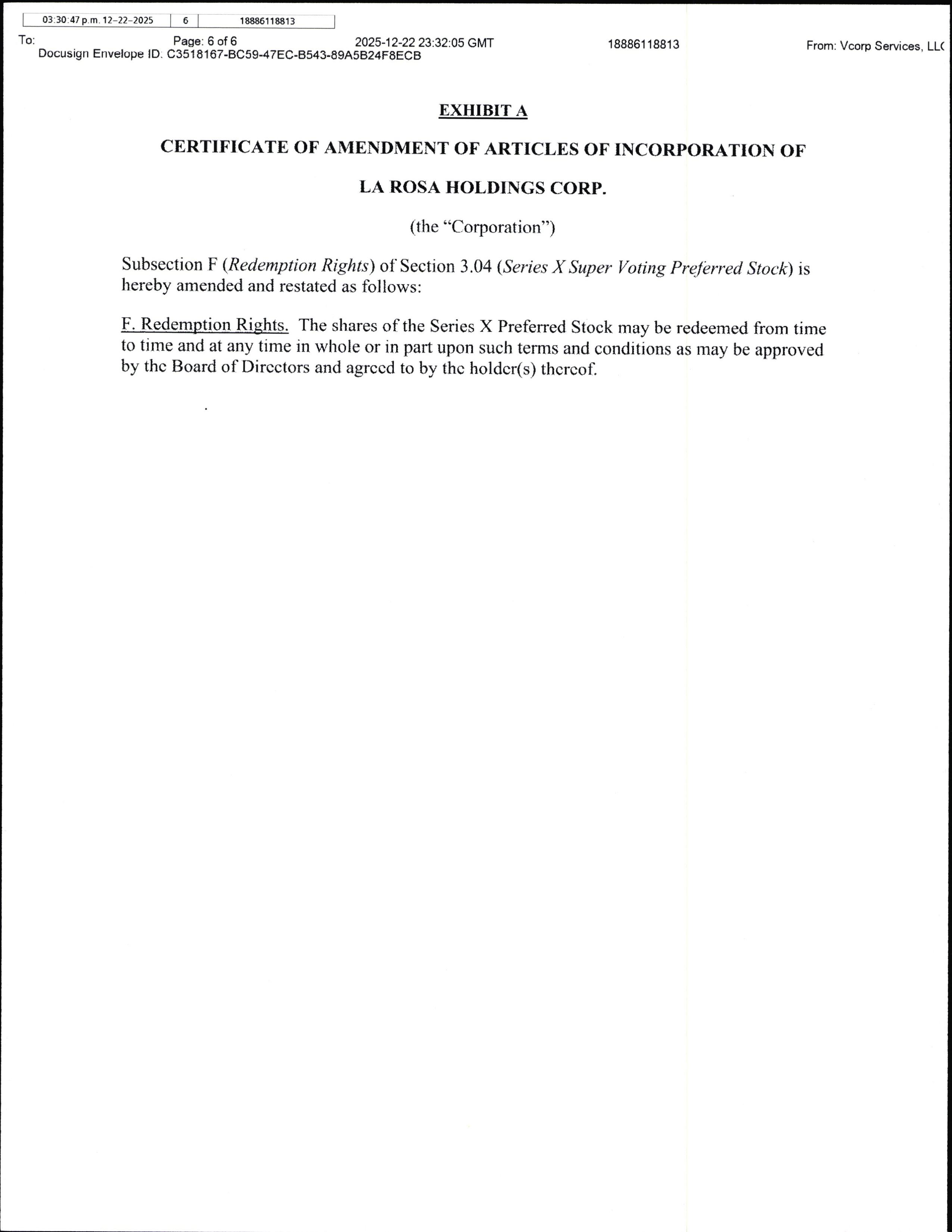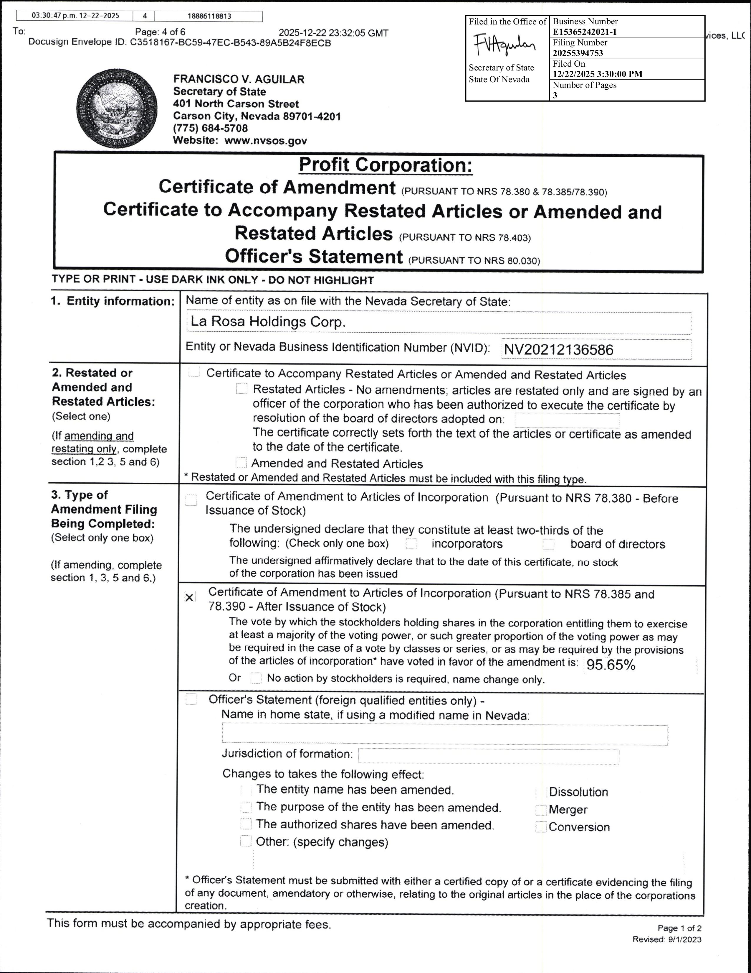 EX-3.1 2 ea027234701ex3-1_larosa.htm CERTIFICATE OF AMENDMENT TO AMENDED AND RESTATED ARTICLES OF INCORPORATION AS FILED ON DECEMBER 22, 2025