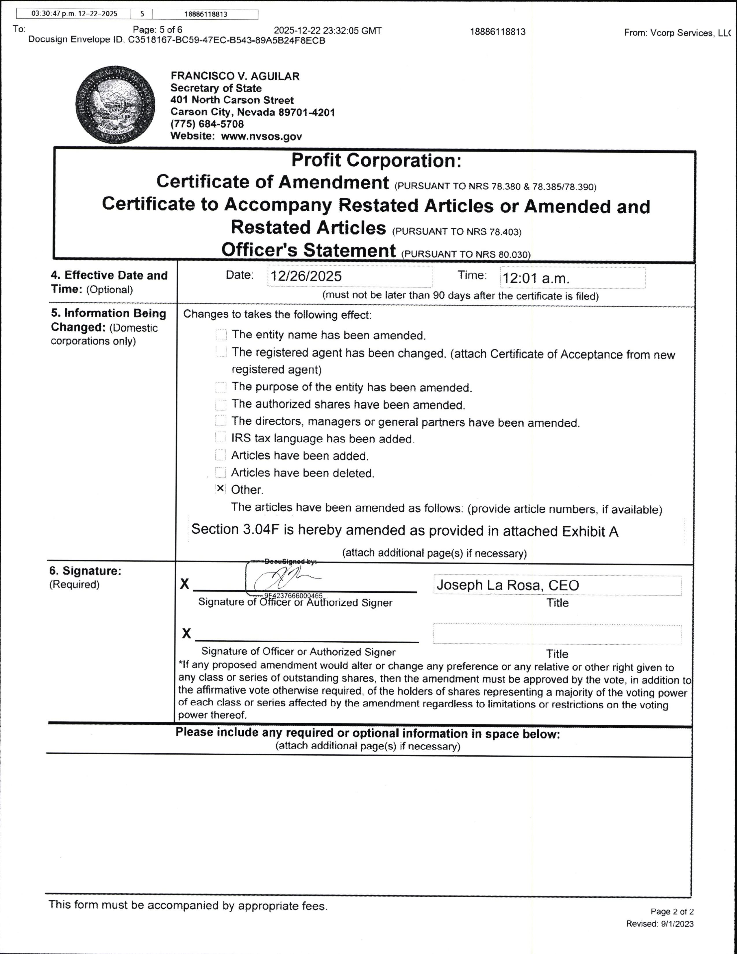 Business Number E15365242021 - 1 Filed in the Office of Filing Number 20255394753 Secretary of State State Of Nevada Filed On 12/22/2025 3:30:00 PM Number of Pages 3