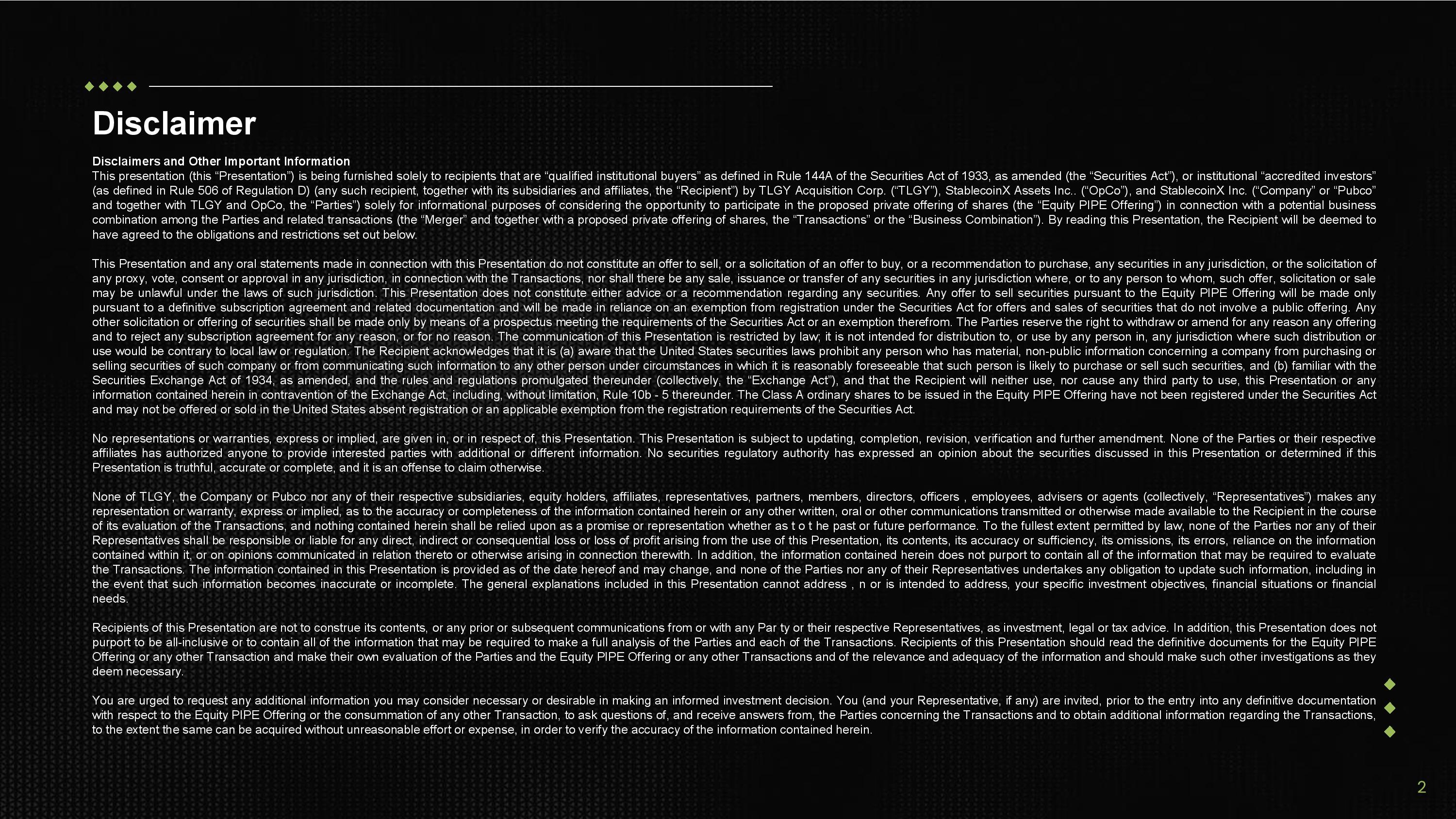 Disclaimer 2 Disclaimers and Other Important Information This presentation (this “Presentation”) is being furnished solely to recipients that are “qualified institutional buyers” as defined in Rule 144 A of the Securities Act of 1933 , as amended (the “Securities Act”), or institutional “accredited investors” (as defined in Rule 506 of Regulation D) (any such recipient, together with its subsidiaries and affiliates, the “Recipient”) by TLGY Acquisition Corp . (“TLGY”), StablecoinX Assets Inc .. (“OpCo”), and StablecoinX Inc . (“Company” or “Pubco” and together with TLGY and OpCo, the “Parties”) solely for informational purposes of considering the opportunity to participate in the proposed private offering of shares (the “Equity PIPE Offering”) in connection with a potential business combination among the Parties and related transactions (the “Merger” and together with a proposed private offering of shares, the “Transactions” or the “Business Combination”) . By reading this Presentation, the Recipient will be deemed to have agreed to the obligations and restrictions set out below . This Presentation and any oral statements made in connection with this Presentation do not constitute an offer to sell, or a solicitation of an offer to buy, or a recommendation to purchase, any securities in any jurisdiction, or the solicitation of any proxy, vote, consent or approval in any jurisdiction, in connection with the Transactions, nor shall there be any sale, issuance or transfer of any securities in any jurisdiction where, or to any person to whom, such offer, solicitation or sale may be unlawful under the laws of such jurisdiction . This Presentation does not constitute either advice or a recommendation regarding any securities . Any offer to sell securities pursuant to the Equity PIPE Offering will be made only pursuant to a definitive subscription agreement and related documentation and will be made in reliance on an exemption from registration under the Securities Act for offers and sales of securities that do not involve a public offering . Any other solicitation or offering of securities shall be made only by means of a prospectus meeting the requirements of the Securities Act or an exemption therefrom . The Parties reserve the right to withdraw or amend for any reason any offering and to reject any subscription agreement for any reason, or for no reason . The communication of this Presentation is restricted by law ; it is not intended for distribution to, or use by any person in, any jurisdiction where such distribution or use would be contrary to local law or regulation . The Recipient acknowledges that it is (a) aware that the United States securities laws prohibit any person who has material, non - public information concerning a company from purchasing or selling securities of such company or from communicating such information to any other person under circumstances in which it is reasonably foreseeable that such person is likely to purchase or sell such securities, and (b) familiar with the Securities Exchange Act of 1934 , as amended, and the rules and regulations promulgated thereunder (collectively, the “Exchange Act”), and that the Recipient will neither use, nor cause any third party to use, this Presentation or any information contained herein in contravention of the Exchange Act, including, without limitation, Rule 10 b - 5 thereunder . The Class A ordinary shares to be issued in the Equity PIPE Offering have not been registered under the Securities Act and may not be offered or sold in the United States absent registration or an applicable exemption from the registration requirements of the Securities Act . No representations or warranties, express or implied, are given in, or in respect of, this Presentation . This Presentation is subject to updating, completion, revision, verification and further amendment . None of the Parties or their respective affiliates has authorized anyone to provide interested parties with additional or different information . No securities regulatory authority has expressed an opinion about the securities discussed in this Presentation or determined if this Presentation is truthful, accurate or complete, and it is an offense to claim otherwise . None of TLGY, the Company or Pubco nor any of their respective subsidiaries, equity holders, affiliates, representatives, partners, members, directors, officers , employees, advisers or agents (collectively, “Representatives”) makes any representation or warranty, express or implied, as to the accuracy or completeness of the information contained herein or any other written, oral or other communications transmitted or otherwise made available to the Recipient in the course of its evaluation of the Transactions, and nothing contained herein shall be relied upon as a promise or representation whether as t o t he past or future performance . To the fullest extent permitted by law, none of the Parties nor any of their Representatives shall be responsible or liable for any direct, indirect or consequential loss or loss of profit arising from the use of this Presentation, its contents, its accuracy or sufficiency, its omissions, its errors, reliance on the information contained within it, or on opinions communicated in relation thereto or otherwise arising in connection therewith . In addition, the information contained herein does not purport to contain all of the information that may be required to evaluate the Transactions . The information contained in this Presentation is provided as of the date hereof and may change, and none of the Parties nor any of their Representatives undertakes any obligation to update such information, including in the event that such information becomes inaccurate or incomplete . The general explanations included in this Presentation cannot address , n or is intended to address, your specific investment objectives, financ