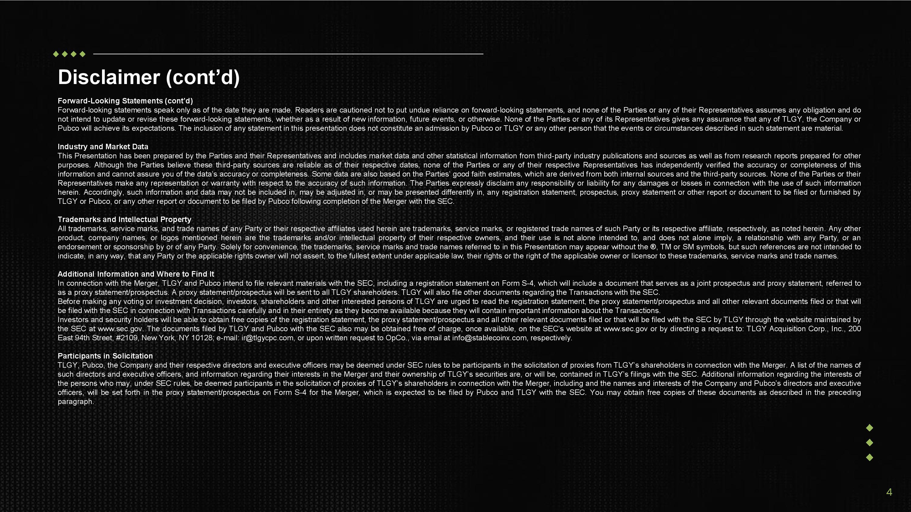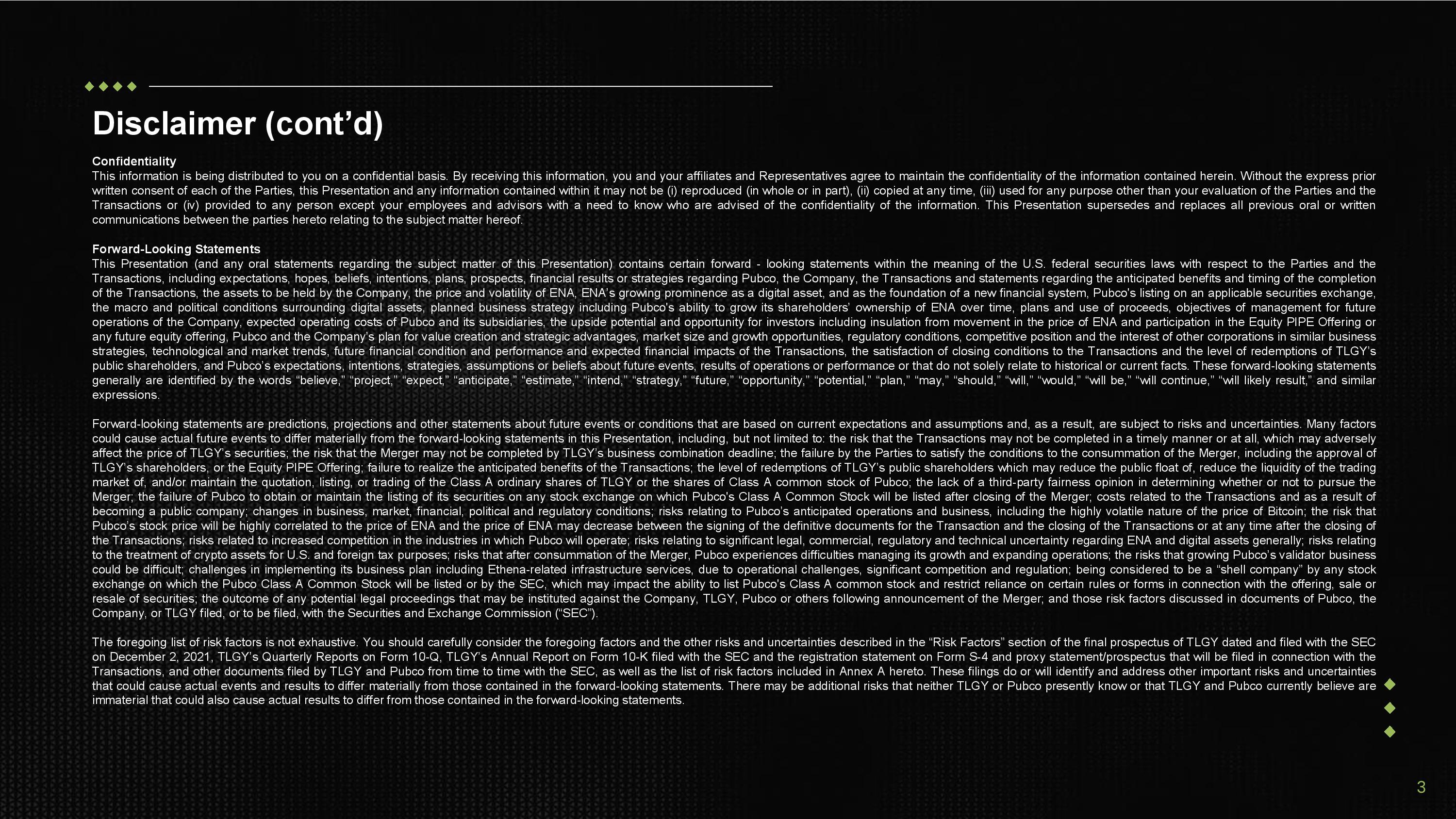 Disclaimer (cont’d) 3 Confidentiality This information is being distributed to you on a confidential basis . By receiving this information, you and your affiliates and Representatives agree to maintain the confidentiality of the information contained herein . Without the express prior written consent of each of the Parties, this Presentation and any information contained within it may not be (i) reproduced (in whole or in part), (ii) copied at any time, (iii) used for any purpose other than your evaluation of the Parties and the Transactions or (iv) provided to any person except your employees and advisors with a need to know who are advised of the confidentiality of the information . This Presentation supersedes and replaces all previous oral or written communications between the parties hereto relating to the subject matter hereof . Forward - Looking Statements This Presentation (and any oral statements regarding the subject matter of this Presentation) contains certain forward - looking statements within the meaning of the U . S . federal securities laws with respect to the Parties and the Transactions, including expectations, hopes, beliefs, intentions, plans, prospects, financial results or strategies regarding Pubco, the Company, the Transactions and statements regarding the anticipated benefits and timing of the completion of the Transactions, the assets to be held by the Company, the price and volatility of ENA, ENA’s growing prominence as a digital asset, and as the foundation of a new financial system, Pubco's listing on an applicable securities exchange, the macro and political conditions surrounding digital assets, planned business strategy including Pubco's ability to grow its shareholders’ ownership of ENA over time, plans and use of proceeds, objectives of management for future operations of the Company, expected operating costs of Pubco and its subsidiaries, the upside potential and opportunity for investors including insulation from movement in the price of ENA and participation in the Equity PIPE Offering or any future equity offering, Pubco and the Company’s plan for value creation and strategic advantages, market size and growth opportunities, regulatory conditions, competitive position and the interest of other corporations in similar business strategies, technological and market trends, future financial condition and performance and expected financial impacts of the Transactions, the satisfaction of closing conditions to the Transactions and the level of redemptions of TLGY’s public shareholders, and Pubco’s expectations, intentions, strategies, assumptions or beliefs about future events, results of operations or performance or that do not solely relate to historical or current facts . These forward - looking statements generally are identified by the words “believe,” “project,” “expect,” “anticipate,” “estimate,” “intend,” “strategy,” “future,” “opportunity,” “potential,” “plan,” “may,” “should,” “will,” “would,” “will be,” “will continue,” “will likely result,” and similar expressions . Forward - looking statements are predictions, projections and other statements about future events or conditions that are based on current expectations and assumptions and, as a result, are subject to risks and uncertainties . Many factors could cause actual future events to differ materially from the forward - looking statements in this Presentation, including, but not limited to : the risk that the Transactions may not be completed in a timely manner or at all, which may adversely affect the price of TLGY’s securities ; the risk that the Merger may not be completed by TLGY’s business combination deadline ; the failure by the Parties to satisfy the conditions to the consummation of the Merger, including the approval of TLGY’s shareholders, or the Equity PIPE Offering ; failure to realize the anticipated benefits of the Transactions ; the level of redemptions of TLGY’s public shareholders which may reduce the public float of, reduce the liquidity of the trading market of, and/or maintain the quotation, listing, or trading of the Class A ordinary shares of TLGY or the shares of Class A common stock of Pubco ; the lack of a third - party fairness opinion in determining whether or not to pursue the Merger ; the failure of Pubco to obtain or maintain the listing of its securities on any stock exchange on which Pubco's Class A Common Stock will be listed after closing of the Merger ; costs related to the Transactions and as a result of becoming a public company ; changes in business, market, financial, political and regulatory conditions ; risks relating to Pubco’s anticipated operations and business, including the highly volatile nature of the price of Bitcoin ; the risk that Pubco’s stock price will be highly correlated to the price of ENA and the price of ENA may decrease between the signing of the definitive documents for the Transaction and the closing of the Transactions or at any time after the closing of the Transactions ; risks related to increased competition in the industries in which Pubco will operate ; risks relating to significant legal, commercial, regulatory and technical uncertainty regarding ENA and digital assets generally ; risks relating to the treatment of crypto assets for U . S . and foreign tax purposes ; risks that after consummation of the Merger, Pubco experiences difficulties managing its growth and expanding operations ; the risks that growing Pubco’s validator business could be difficult ; challenges in implementing its business plan including Ethena - related infrastructure services, due to operational challenges, significant competition and regulation ; being considered to be a “shell company” by any stock exchange on which the Pubco Class A Common Stock will be listed or by the SEC, which may impact the ability to list Pubco's Class A common stock and 