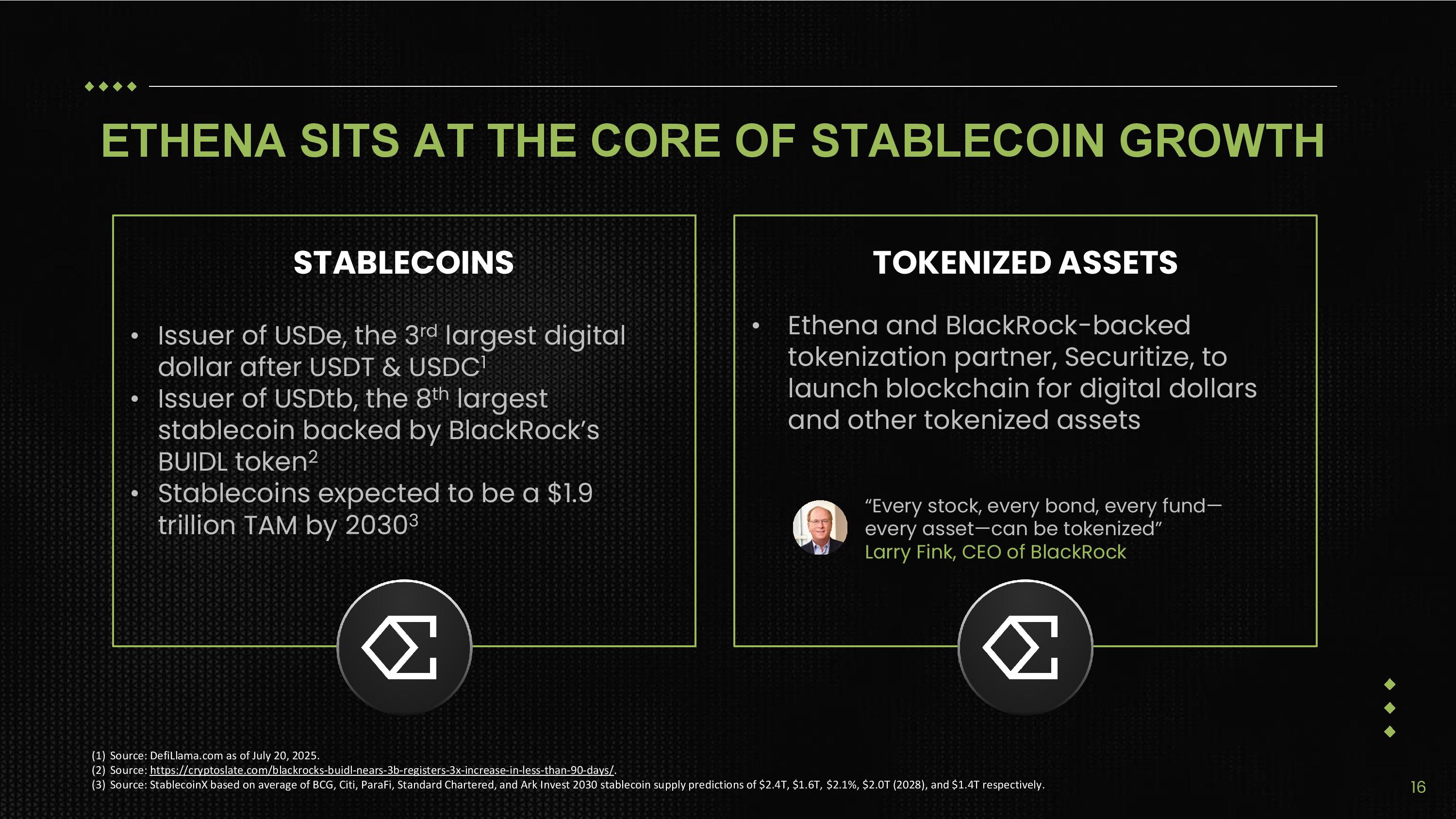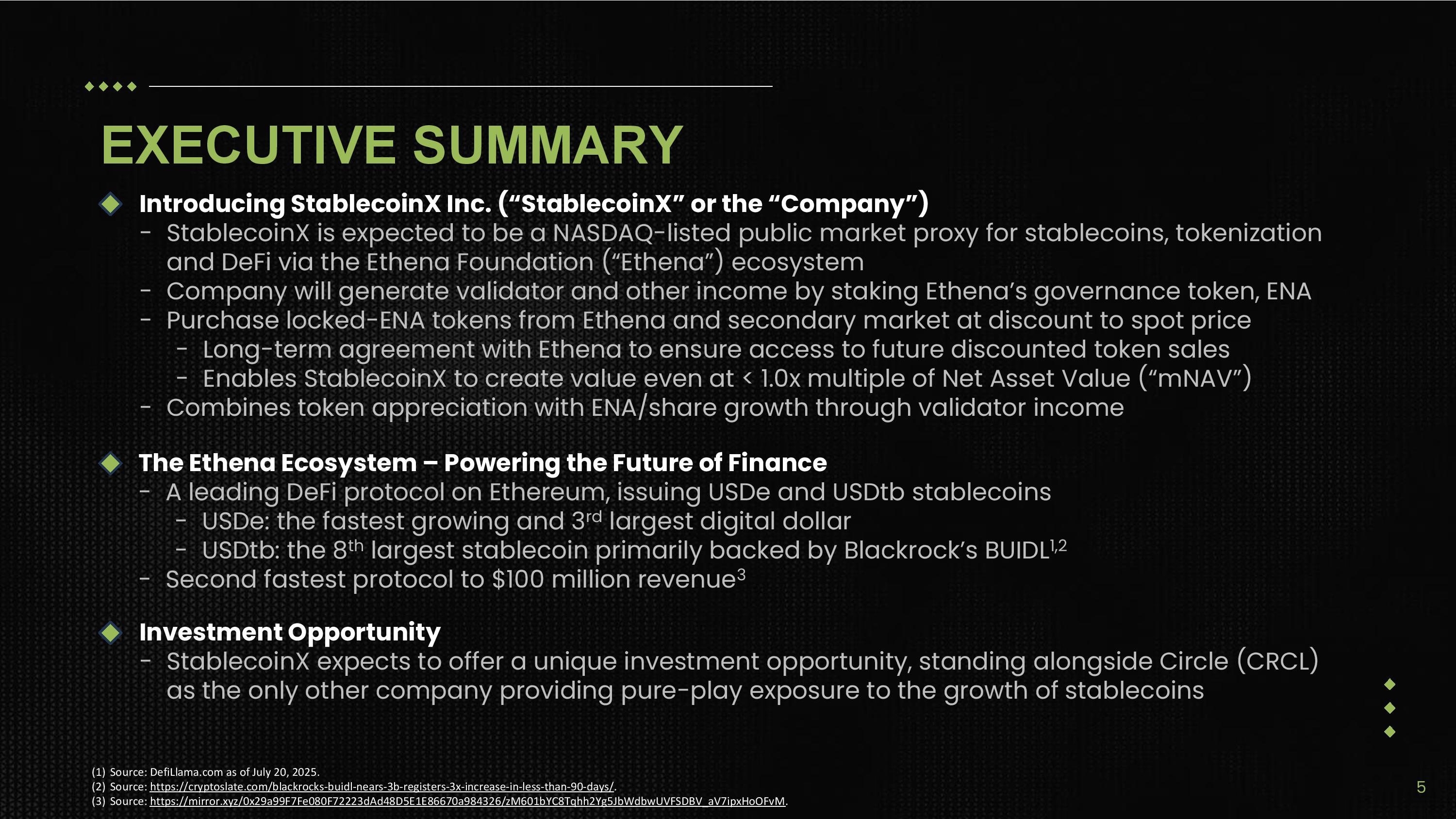 EXECUTIVE SUMMARY Introducing StablecoinX Inc. (“StablecoinX” or the “Company”) - StablecoinX is expected to be a NASDAQ - listed public market proxy for stablecoins, tokenization and DeFi via the Ethena Foundation (“Ethena”) ecosystem - Company will generate validator and other income by staking Ethena’s governance token, ENA - Purchase locked - ENA tokens from Ethena and secondary market at discount to spot price - Long - term agreement with Ethena to ensure access to future discounted token sales - Enables StablecoinX to create value even at < 1.0x multiple of Net Asset Value (“mNAV”) - Combines token appreciation with ENA/share growth through validator income The Ethena Ecosystem – Powering the Future of Finance - A leading DeFi protocol on Ethereum, issuing USDe and USDtb stablecoins - USDe: the fastest growing and 3 rd largest digital dollar - USDtb: the 8 th largest stablecoin primarily backed by Blackrock’s BUIDL 1,2 - Second fastest protocol to $100 million revenue 3 Investment Opportunity - StablecoinX expects to offer a unique investment opportunity, standing alongside Circle (CRCL) as the only other company providing pure - play exposure to the growth of stablecoins (1) Source: DefiLlama.com as of July 20, 2025. (2) Source: https://cryptoslate.com/blackrocks - buid l - nears - 3b - registers - 3x - increase - in - less - than - 90 - days/ . (3) Source: https://mirror.xyz/0x29a99F7Fe080F72223dAd48D5E1E86670a984326/zM601bYC8Tqhh2Yg5JbWdbwUVFSDBV_aV7ipxHoOFvM . 5