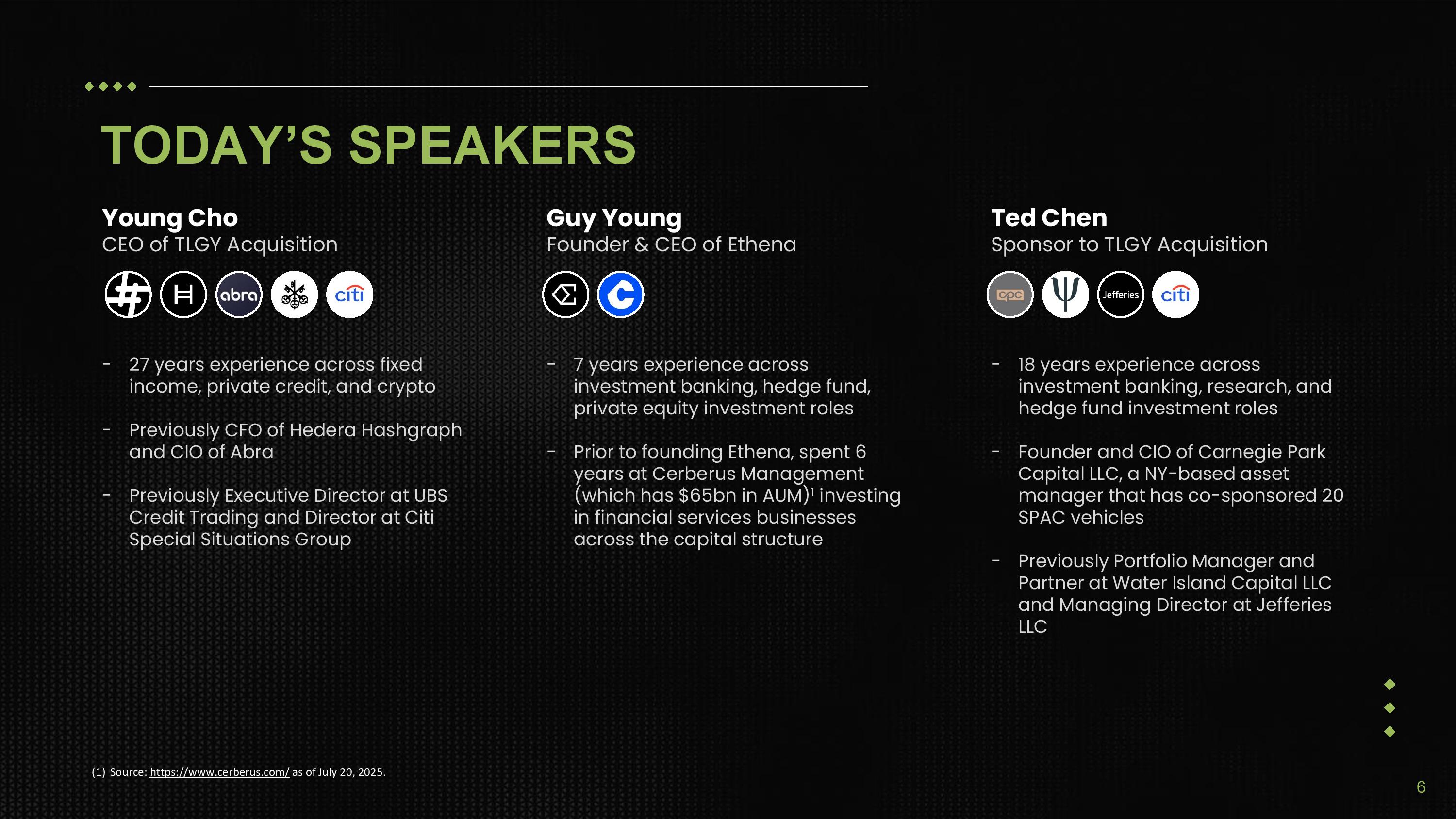 TODAY’S SPEAKERS Young Cho CEO of TLGY Acquisition 6 - 27 years experience across fixed income, private credit, and crypto - Previously CFO of Hedera Hashgraph and CIO of Abra - Previously Executive Director at UBS Credit Trading and Director at Citi Special Situations Group Guy Young Founder & CEO of Ethena - 7 years experience across investment banking, hedge fund, private equity investment roles - Prior to founding Ethena, spent 6 years at Cerberus Management (which has $65bn in AUM) 1 investing in financial services businesses across the capital structure Ted Chen Sponsor to TLGY Acquisition - 18 years experience across investment banking, research, and hedge fund investment roles - Founder and CIO of Carnegie Park Capital LLC, a NY - based asset manager that has co - sponsored 20 SPAC vehicles - Previously Portfolio Manager and Partner at Water Island Capital LLC and Managing Director at Jefferies LLC (1) Source: https://www.cerberus.com/ as of July 20, 2025.