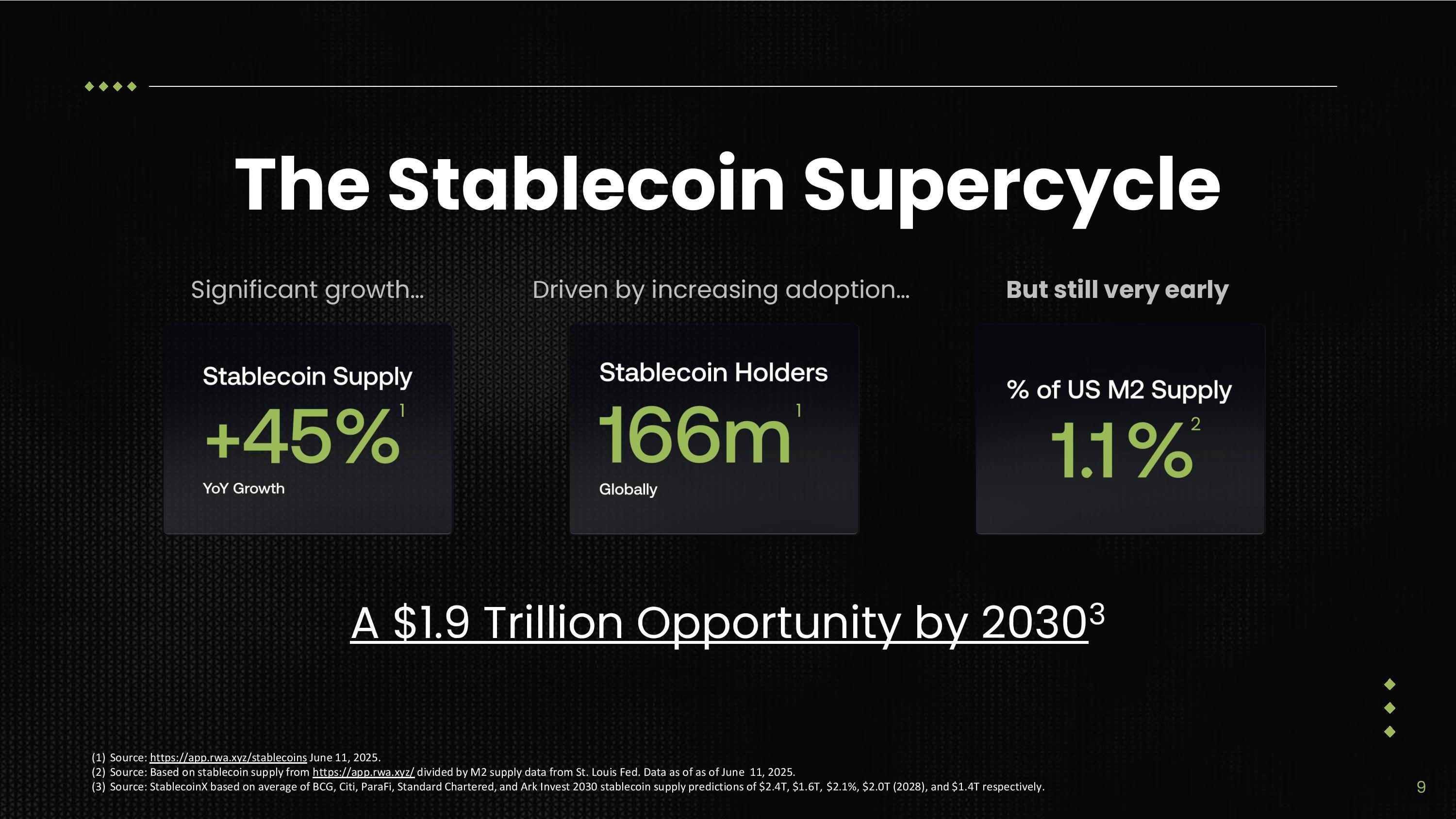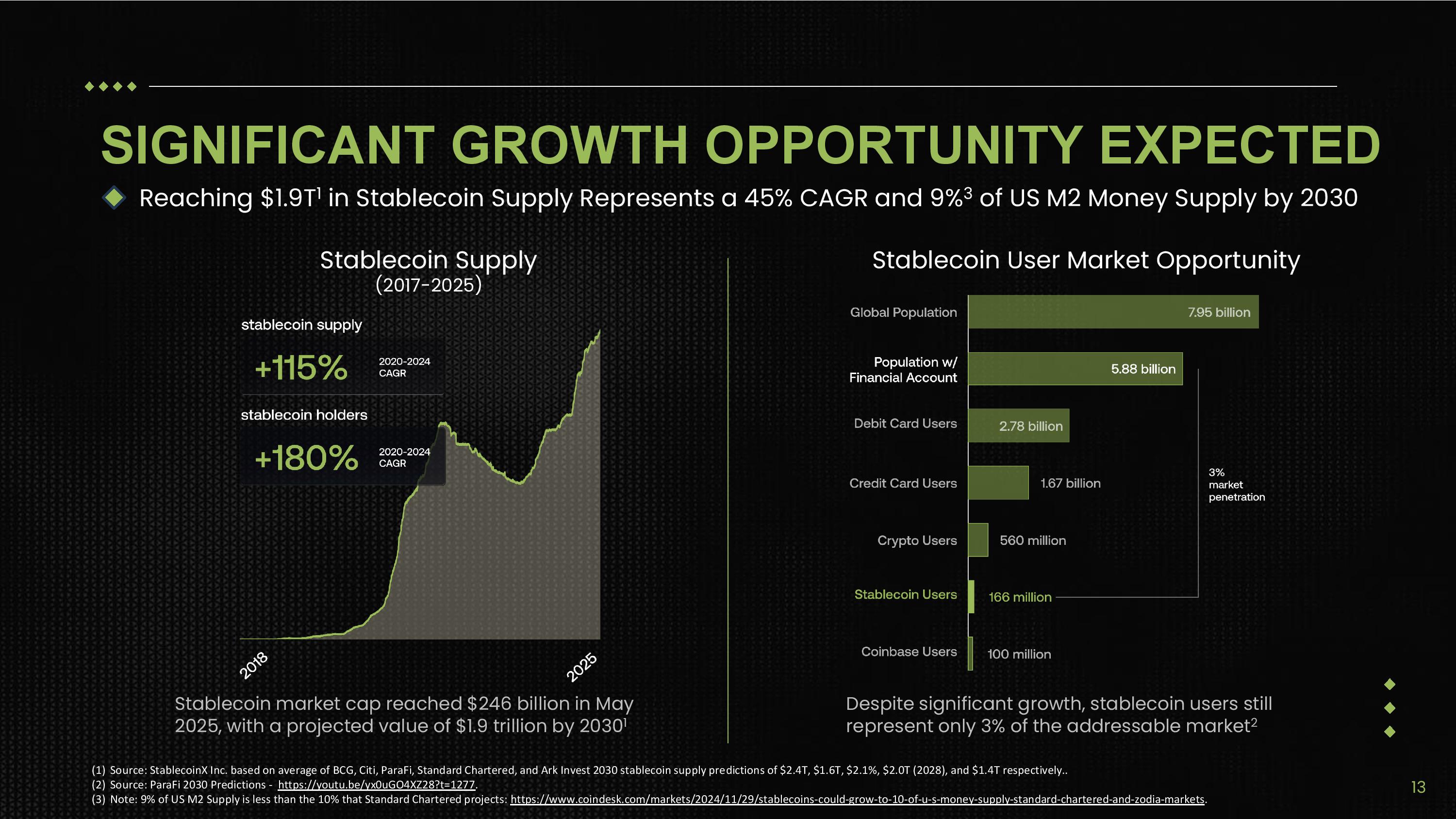 (1) Source: StablecoinX Inc. based on average of BCG, Citi, ParaFi, Standard Chartered, and Ark Invest 2030 stablecoin supply predictions of $2.4T, $1.6T, $2.1%, $2.0T (2028), and $1.4T respectively.. (2) Source: ParaFi 2030 Predictions - https://youtu.be/yx0uGO4XZ28?t=1277 . (3) Note: 9% of US M2 Supply is less than the 10% that Standard Chartered projects: https://www.coindesk.com/markets/2024/11/29/stablecoins - could - grow - to - 10 - of - u - s - money - supply - standard - chartered - and - zodia - market s . Stablecoin Supply Stablecoin User Market Opportunity (2017 - 2025) Stablecoin market cap reached $246 billion in May 2025, with a projected value of $1.9 trillion by 2030 1 Despite significant growth, stablecoin users still represent only 3% of the addressable market 2 SIGNIFICANT GROWTH OPPORTUNITY EXPECTED Reaching $1.9T 1 in Stablecoin Supply Represents a 45% CAGR and 9% 3 of US M2 Money Supply by 2030 13