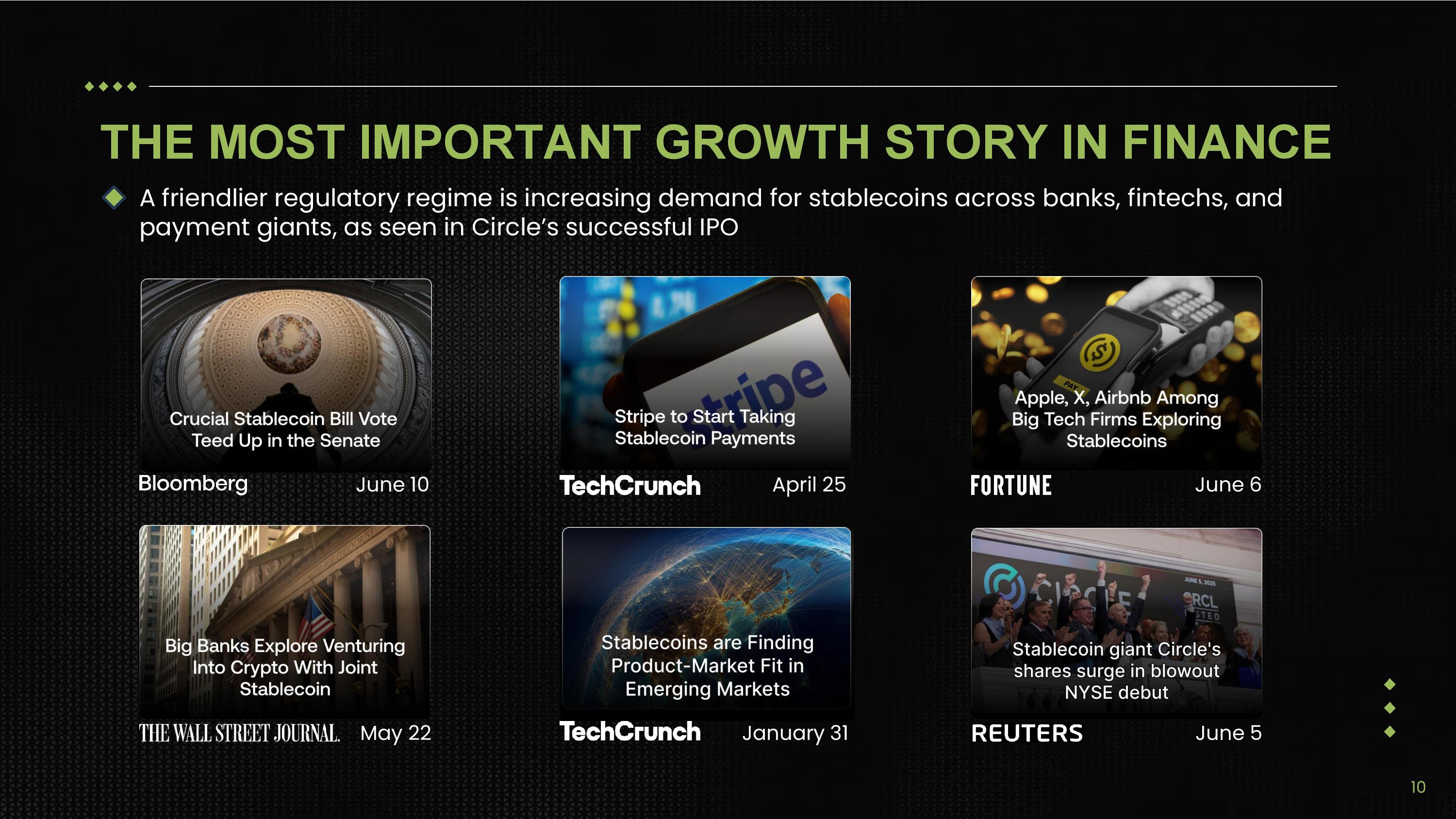 THE MOST IMPORTANT GROWTH STORY IN FINANCE June 10 May 22 April 25 January 31 June 6 June 5 A friendlier regulatory regime is increasing demand for stablecoins across banks, fintechs, and payment giants, as seen in Circle’s successful IPO 10