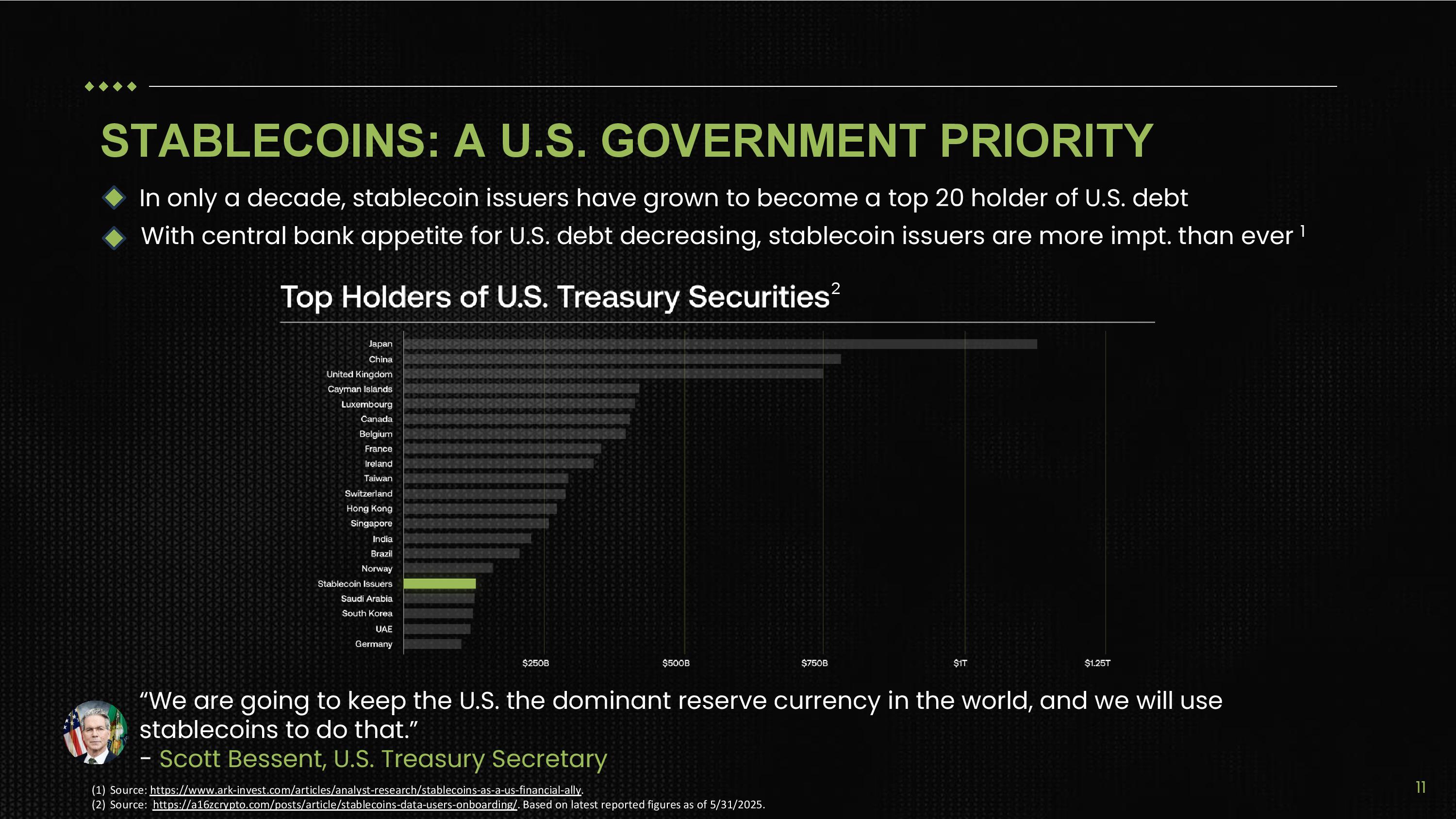 STABLECOINS: A U.S. GOVERNMENT PRIORITY “We are going to keep the U.S. the dominant reserve currency in the world, and we will use stablecoins to do that.” - Scott Bessent, U.S. Treasury Secretary (1) Source: https://www.ark - invest.com/articles/analyst - research/stablecoins - as - a - us - financial - ally . (2) Source: https://a16zcrypto.com/posts/article/stablecoins - data - users - onboarding/ . Based on latest reported figures as of 5/31/2025. In only a decade, stablecoin issuers have grown to become a top 20 holder of U.S. debt With central bank appetite for U.S. debt decreasing, stablecoin issuers are more impt. than ever 1 2 11