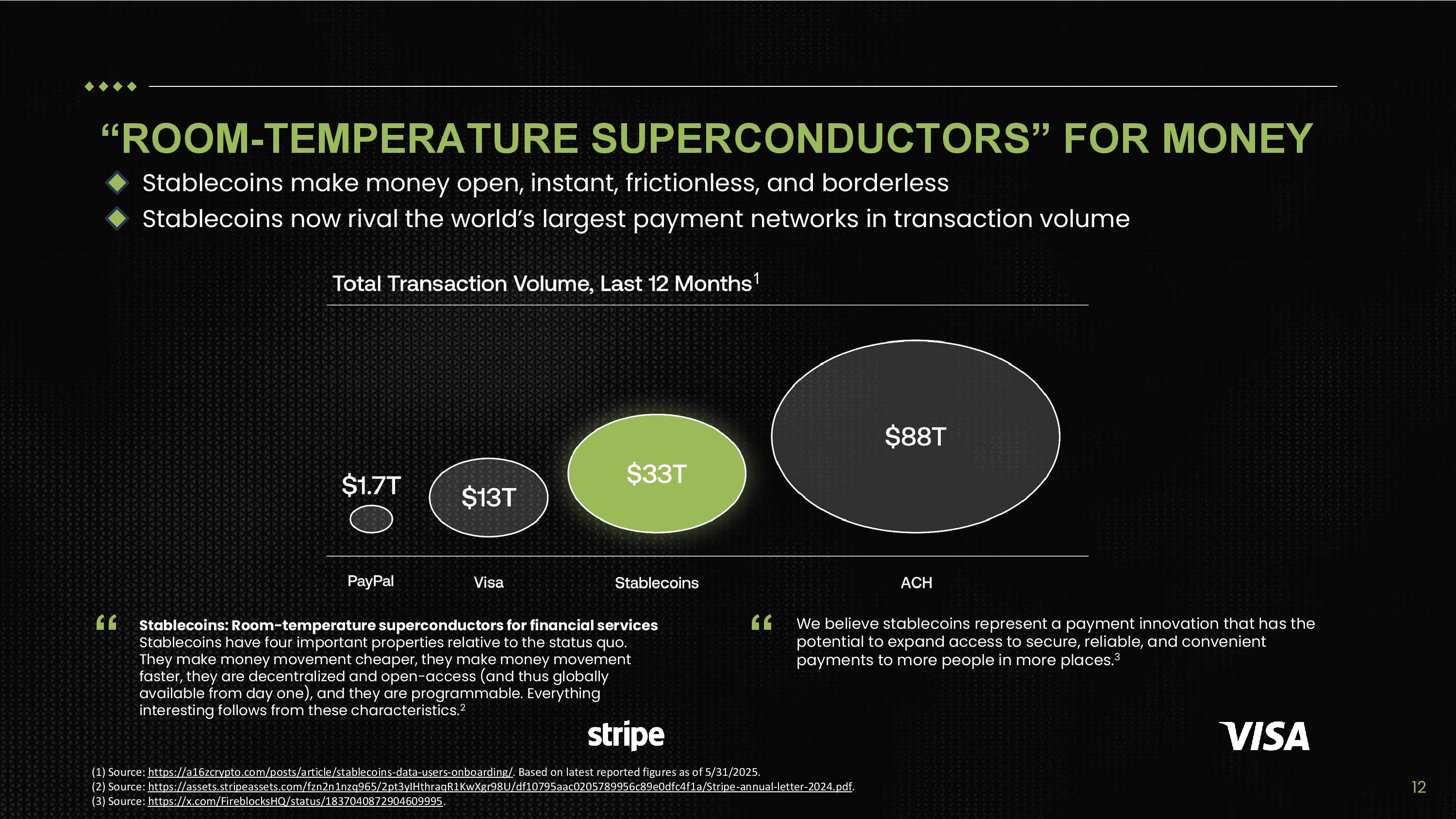“ “ We believe stablecoins represent a payment innovation that has the potential to expand access to secure, reliable, and convenient payments to more people in more places. 3 “ROOM - TEMPERATURE SUPERCONDUCTORS” FOR MONEY (1) Source: https://a16zcrypto.com/posts/article/stablecoins - data - users - onboarding/ . Based on latest reported figures as of 5/31/2025. (2) Source: https://assets.stripeassets.com/fzn2n1nzq965/2pt3yIHthraqR1KwXgr98U/df10795aac0205789956c89e0dfc4f1a/Stripe - annual - letter - 2024.p df . (3) Source: https://x.com/FireblocksHQ/status/1837040872904609995 . Stablecoins make money open, instant, frictionless, and borderless Stablecoins now rival the world’s largest payment networks in transaction volume Stablecoins: Room - temperature superconductors for financial services Stablecoins have four important properties relative to the status quo. They make money movement cheaper, they make money movement faster, they are decentralized and open - access (and thus globally available from day one), and they are programmable. Everything interesting follows from these characteristics. 2 1 12